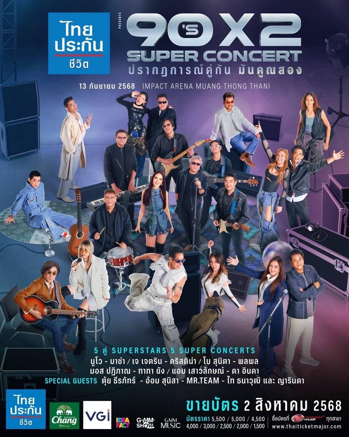 เตรียมตัวให้พร้อม เพราะนี่ไม่ใช่แค่คอนเสิร์ต แต่พร้อมนำคุณไปสัมผัสกับห้วงเวลาแห่งความสุข ความทรงจำ และความมันแบบไม่มียั้ง กับ “ไทยประกันชีวิต presents 90’s x 2 SUPER CONCERT ปรากฏการณ์คู่กัน มันคูณสอง” การรวมตัวครั้งประวัติศาสตร์ของเหล่าศิลปินคู่ขวัญและตัวท็อประดับตำนานแห่งยุค 90’s ที่จะมาสร้างสรรค์ค่ำคืนสุดพิเศษที่ยิ่งใหญ่ที่สุดแห่งปี 2568 ในวันเสาร์ที่ 13 กันยายน 2568 ณ อิมแพ็ค อารีน่า เมืองทองธานี โดยทีมผู้จัดงานมืออาชีพอย่าง “IDEA FACT” หน่วยงานภายใต้ “GMM SHOW” ที่จะกลับมาสร้างความประทับใจอีกครั้ง