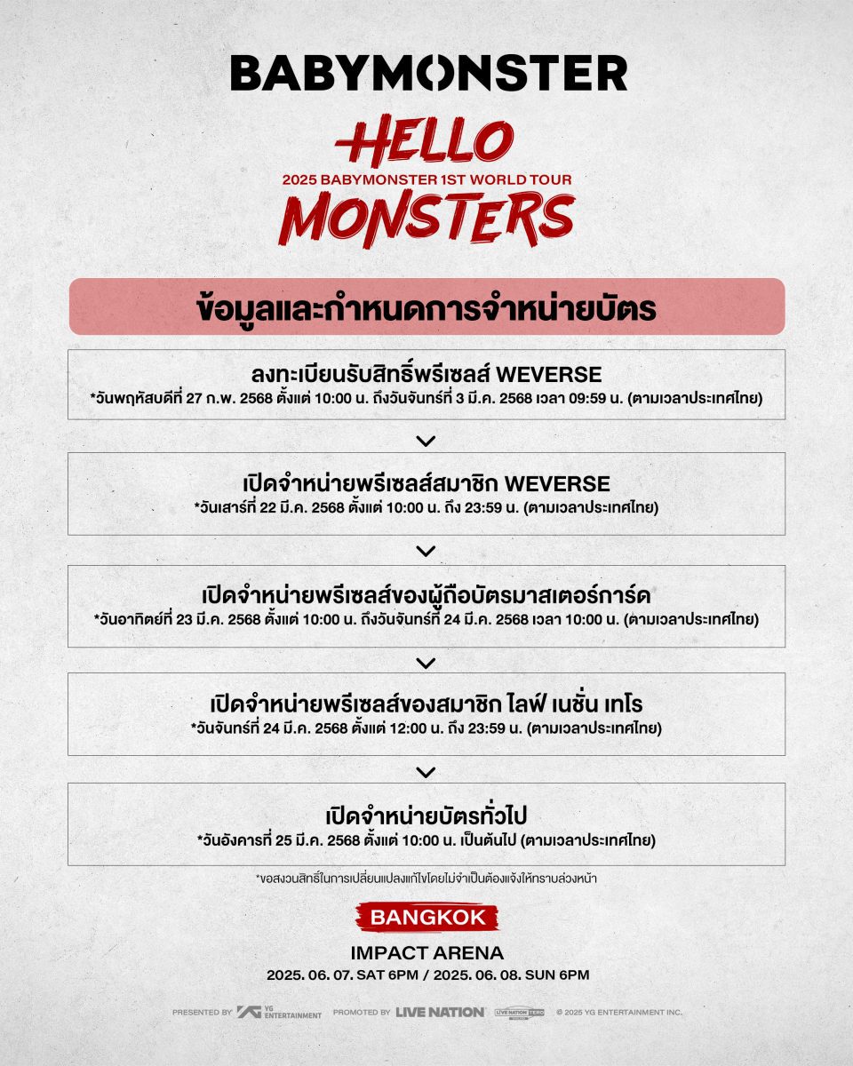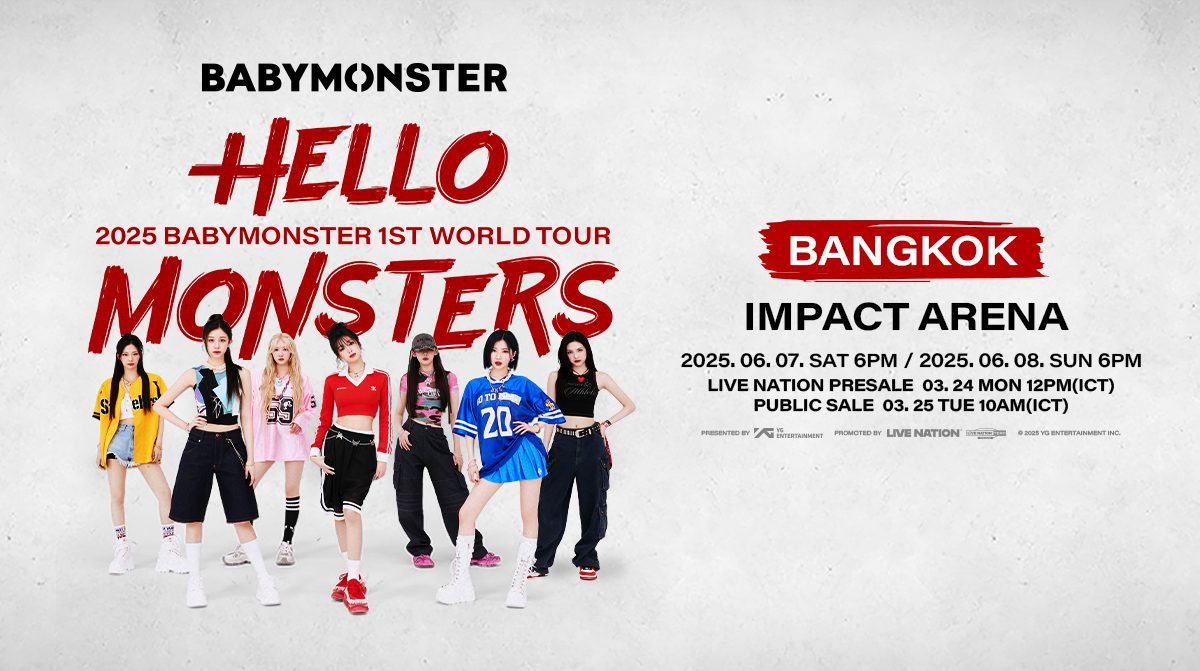 แฟนชาวไทยห้ามพลาดเตรียมตัวมาเจอกันที่คอนเสิร์ต ‘2025 BABYMONSTER 1st WORLD TOUR <HELLO MONSTERS> IN BANGKOK’ 7 – 8 มิถุนายนนี้ ที่อิมแพ็ค อารีน่า ติดตามรายละเอียดเพิ่มเติมและแพคเกจวีไอพีได้ทางโซเชียลมีเดียของ Live Nation Tero