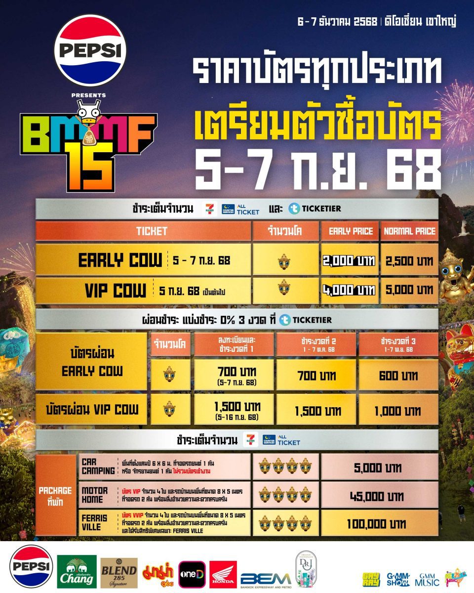 • เปิดจำหน่ายบัตร VIP COW ราคา 4,000 บาท (จากปกติ 5,000 บาท) ตั้งแต่วันที่ 5 กันยายน 2568 เวลา 08:00 น. เป็นต้นไป ที่ Counter Service All Ticket ในร้าน 7- Eleven ทุกสาขาทั่วประเทศ / เว็บไซต์ www.allticket.com/event/BigMountainMusicFestival15 / เว็บไซต์ https://ticketier.events/Hy4mb / แอปพลิเคชัน TICKETIER และบัตรผ่อน VIP COW (ชำระ 3 งวด) ที่เว็บไซต์ https://ticketier.events/uSnab / แอปพลิเคชัน TICKETIER