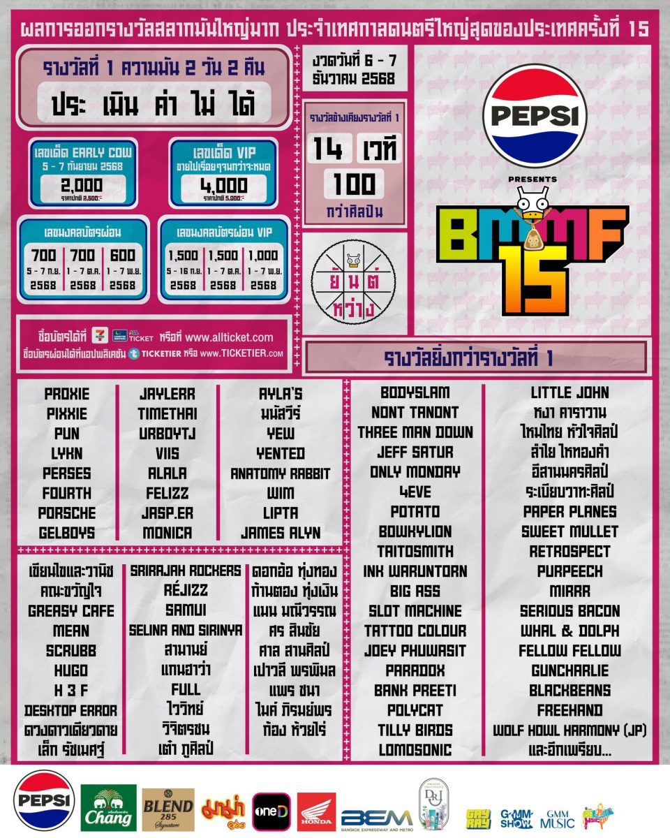 • เปิดจำหน่ายบัตร CAR CAMPING ราคา 5,000 บาท (ไม่รวมบัตรเข้างาน) บัตร MOTOR HOME ราคา 45,000 บาท (รวมบัตร VIP 4 ใบ) และบัตร FERRIS VILLE ราคา 100,000 บาท (รวมบัตร VVIP 4 ใบ) ตั้งแต่วันที่ 5 กันยายน 2568 เวลา 08:00 น. เป็นต้นไป ที่ Counter Service All Ticket ในร้าน 7- Eleven ทุกสาขาทั่วประเทศ และ เว็บไซต์ www.allticket.com/event/BigMountainMusicFestival15