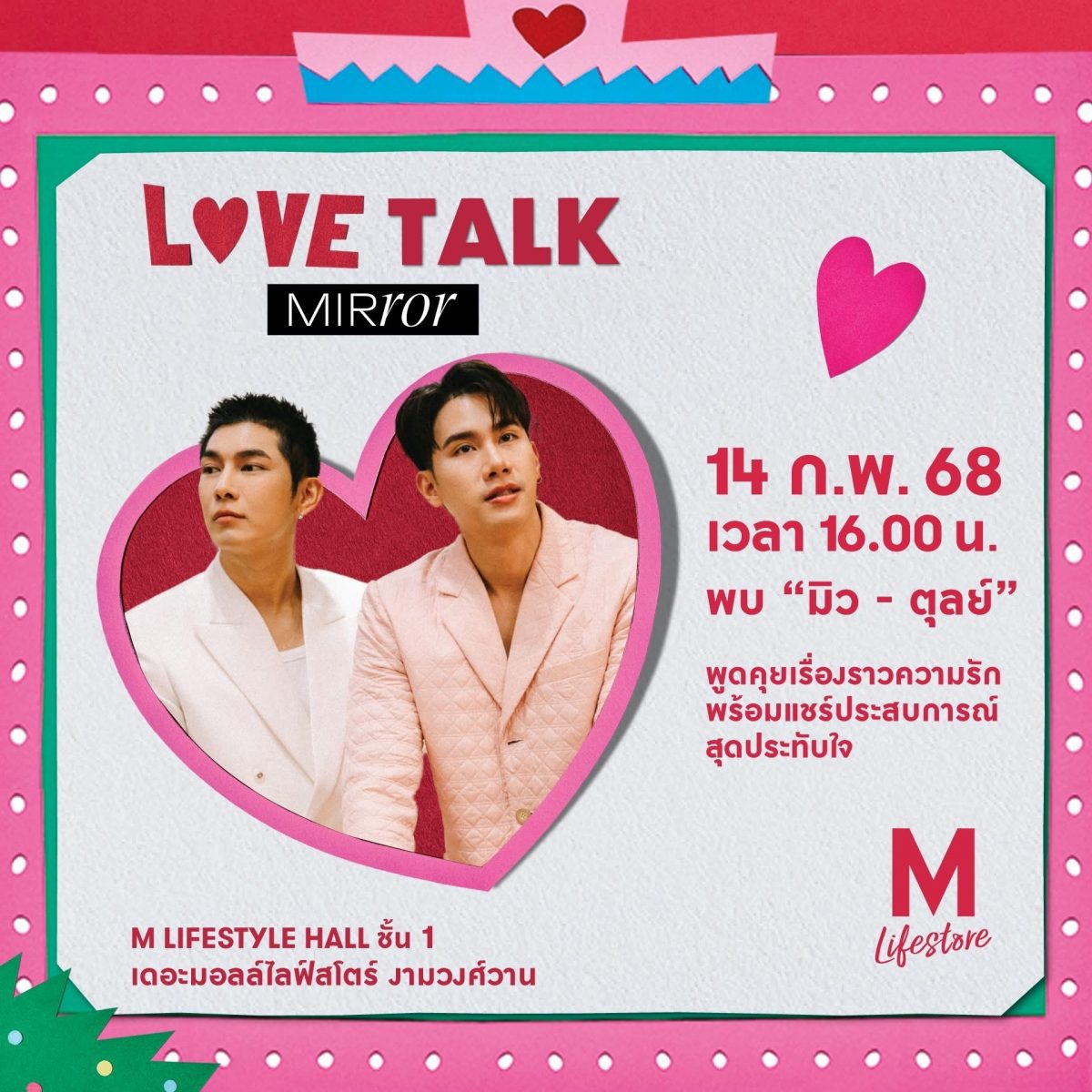 เดอะมอลล์ไลฟ์สโตร์ ท่าพระ ที่ M LIFESTYLE HALL ชั้น G พบกับกิจกรรมความหวานร่วมเฉลิมฉลองทุกความรัก ทุกสไตล์ ทุกความสัมพันธ์ พร้อมฟินกับคู่จิ้นมาแรงแห่งปี ในวันที่ 14 ก.พ. 68 เวลา 18.00 น. พบกับ “วิลเลี่ยม-เอส” คู่จิ้นจากซีรีย์ “THAMEPO” ช่อง GMM25 และวันที่ 15 – 16 ก.พ. 68 เวลา 16.00 น. พบความบันเทิงและการแสดงจากน้องๆ วงไอดอลชั้นนำ
