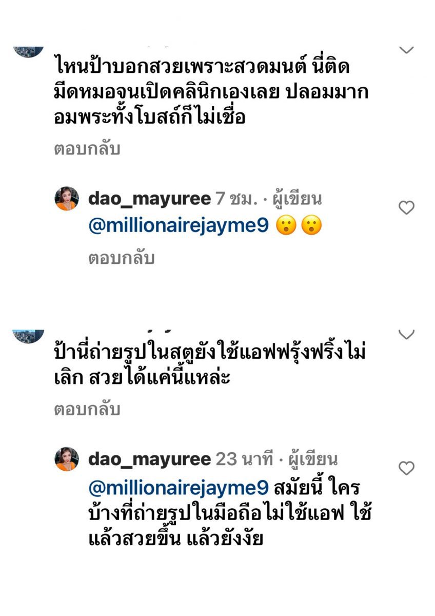 นอกจากนี้ยังมีอีกโพสต์หนึ่งที่ด้านนักร้องลูกทุ่งดังโพสต์ลงแคปชันว่า “ใส ๆ เบา ๆ” ก็เจอดี ชาวเน็ต เมนต์ถามว่า “ไหนป้าบอกว่าสวยเพราะสวดมนต์ นี่ติดมีดหมอจนเปิดคลินิกเองเลย ปลอมมากอมพระทั้งโบสถ์มาพูดก็ไม่เชื่อ” ทำให้ เจ้าตัว ต้องตอบกลับว่า “สวยเพราะสวดมนต์มันมาจากภายในสู่ภายนอก ส่วนเปิดคลินิกเอาไว้ดูแลตัวเองให้หน้าสวยงัยคะ จะได้ไม่ผิดพลาดเหมือนเมื่อก่อนอีก” สวนกลับแบบนี้เรื่องก็เงียบเลยจ้า