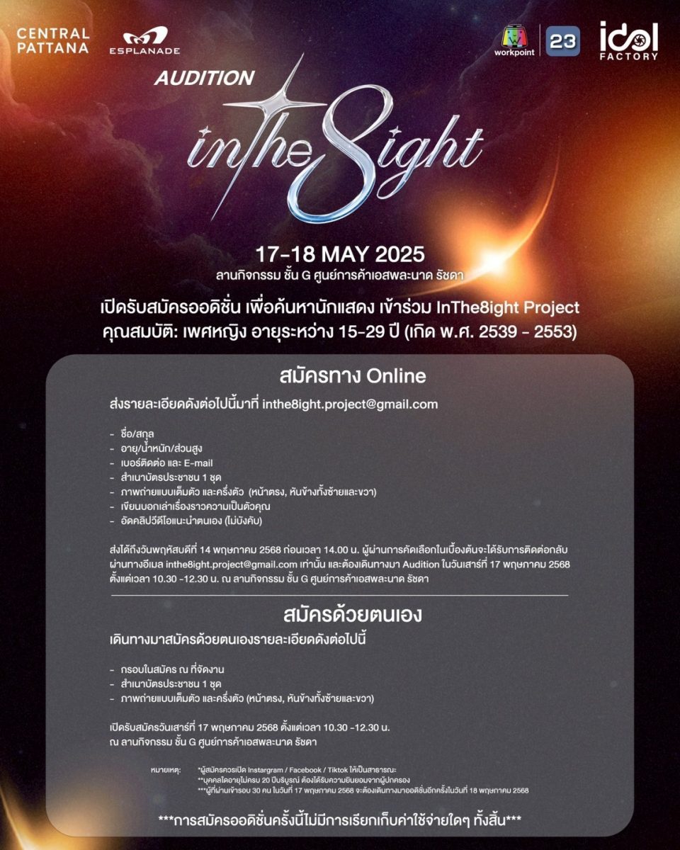 ทั้งนี้ผู้ที่ผ่านเข้ารอบวันที่ 17 พฤษภาคม 2568 จะต้องเดินทางมาออดิชั่นด้วยตนเองอีกครั้ง ในวันที่ 18 พฤษภาคม 2568 ณ ลานกิจกรรม ชั้น G ศูนย์การค้าเอสพละนาด รัชดา โดยการสมัครออดิชั่นครั้งนี้ ไม่มีการเรียกเก็บค่าใช้จ่ายใด ๆ ทั้งสิ้น !