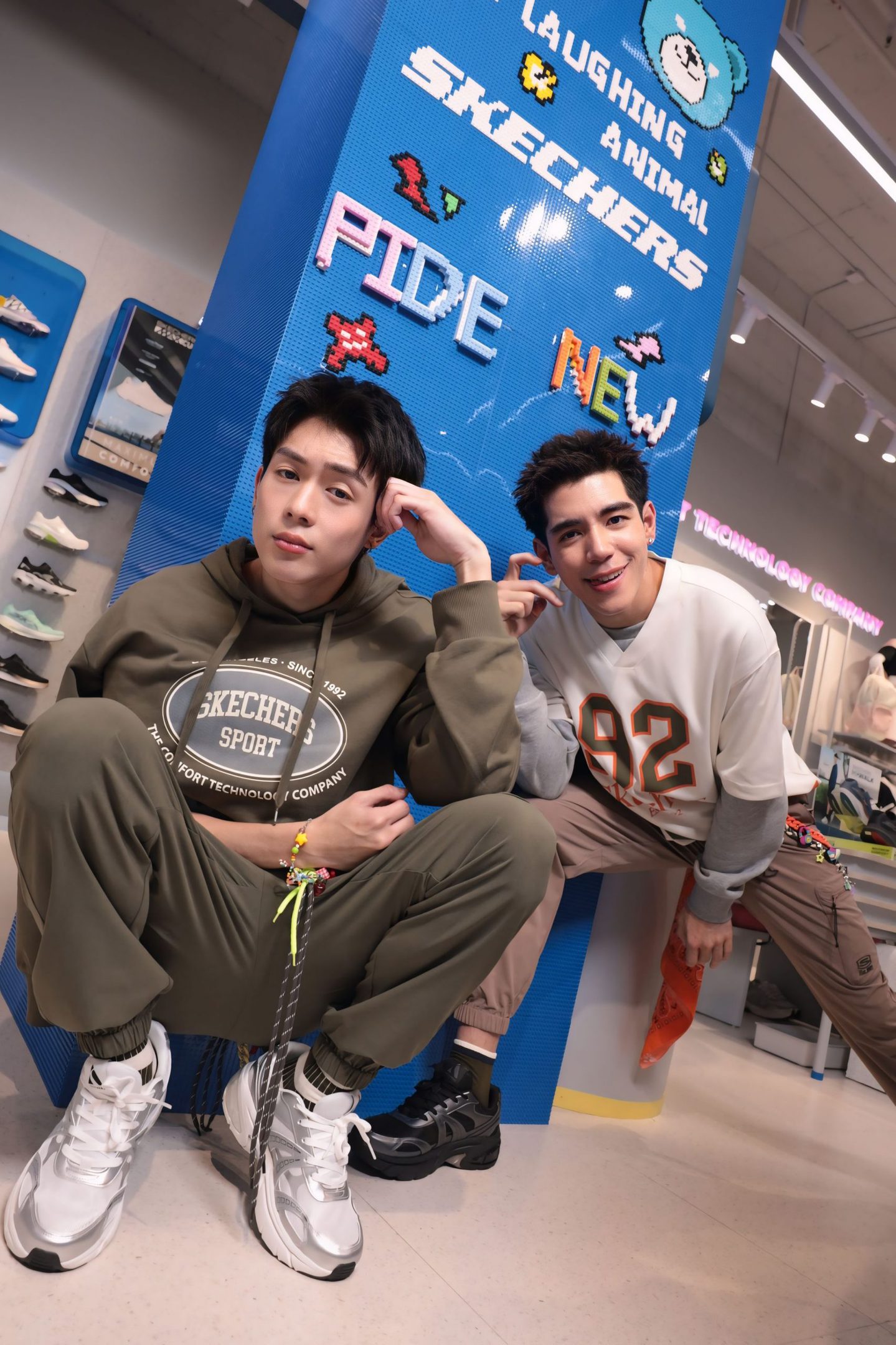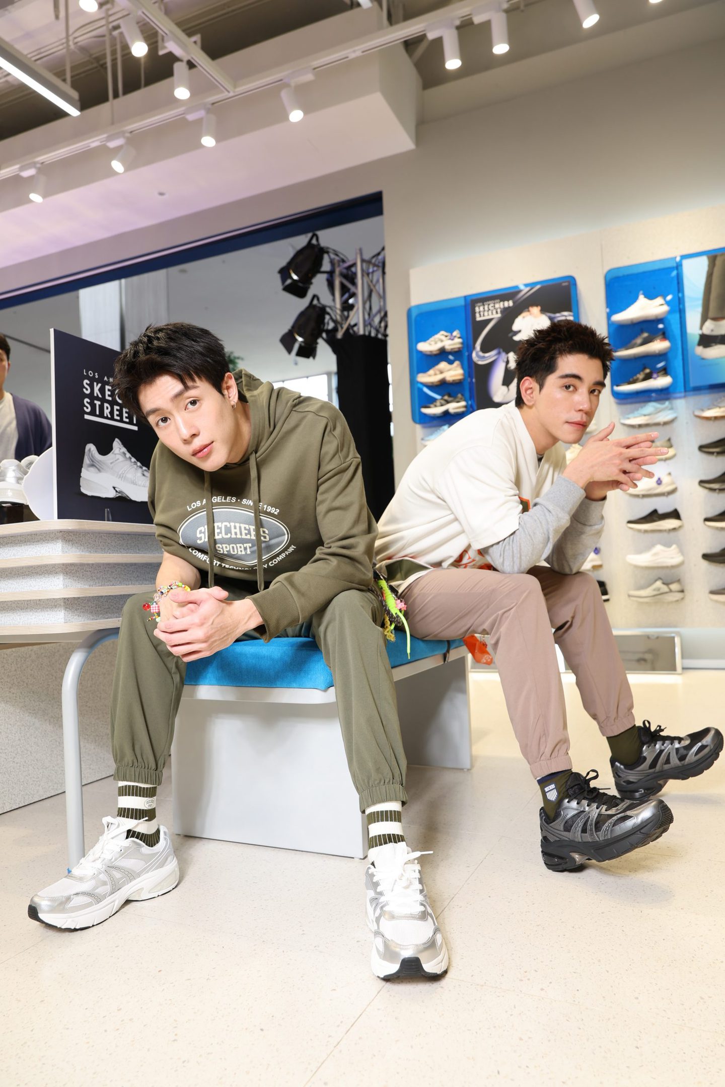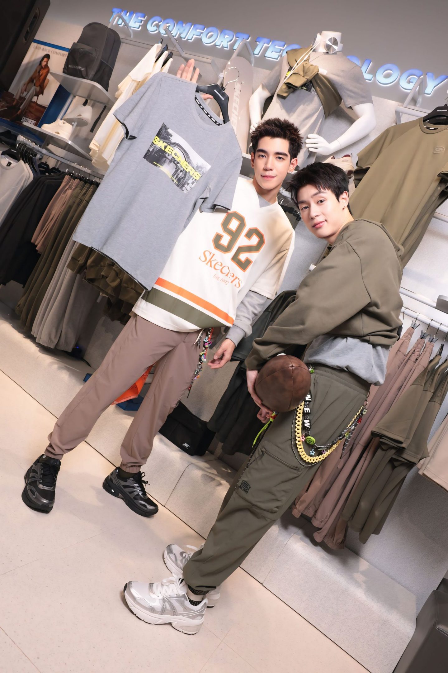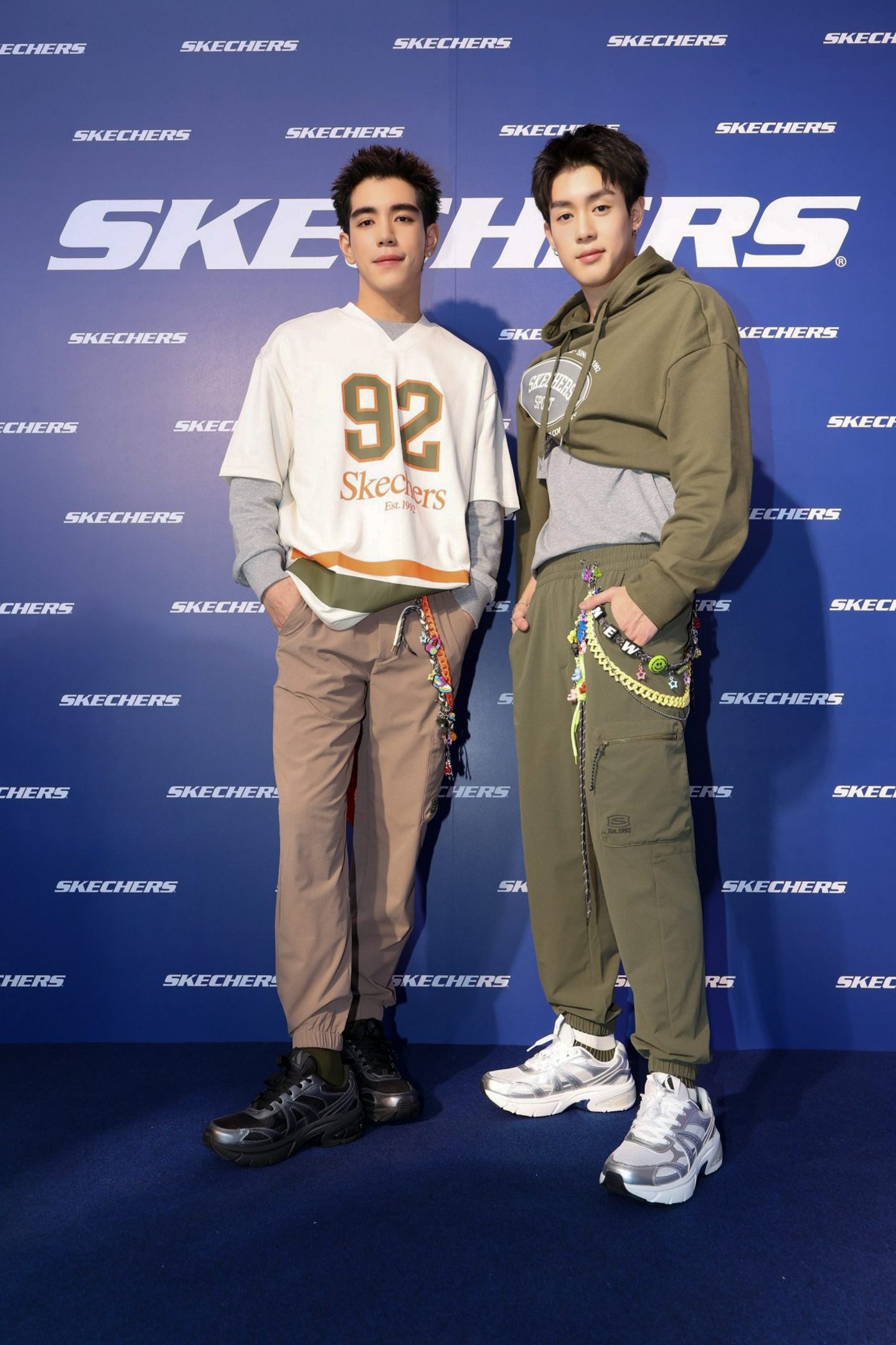ในขณะที่ทางฟากของสองหนุ่ม ไปป์-มนทภูมิ สุมนวรางกูร และ นิว-ชยภัค ตันประยูร ก็ดูโดดเด่นไม่แพ้กัน ไปป์สวมเสื้อยืดแนวเรโทรสปอร์ตพิมพ์ลายตัวเลข 92 ปีที่แบรนด์รองเท้าชื่อก้อง Skechers ได้ถือกำเนิด จับคู่กับกางเกงขายาว สีน้ำตาลสวมใส่สบาย เพิ่มความคูลด้วยกระเป๋าคาดเอวสีดำตัดกัน และสวมสนีกเกอร์สีดำตัดกับแถบสีเงินเมทัลลิก ทางฟากของนิวมาในลุคเท่แบบคูลๆ สวมเสื้อยืดพิมพ์ลายโลโก้ Skechers สีเขียวนีออน สวมทับด้วยเสื้อฮูดดี้โอเวอร์ไซซ์สีเขียวไอวี่โทนสีเข้ากันกับกางเกงขายาวดีไซน์สปอร์ตและถุงเท้าลายขวาง สวมสนีกเกอร์สีขาวคาดแถบสีเงินเมทัลลิก