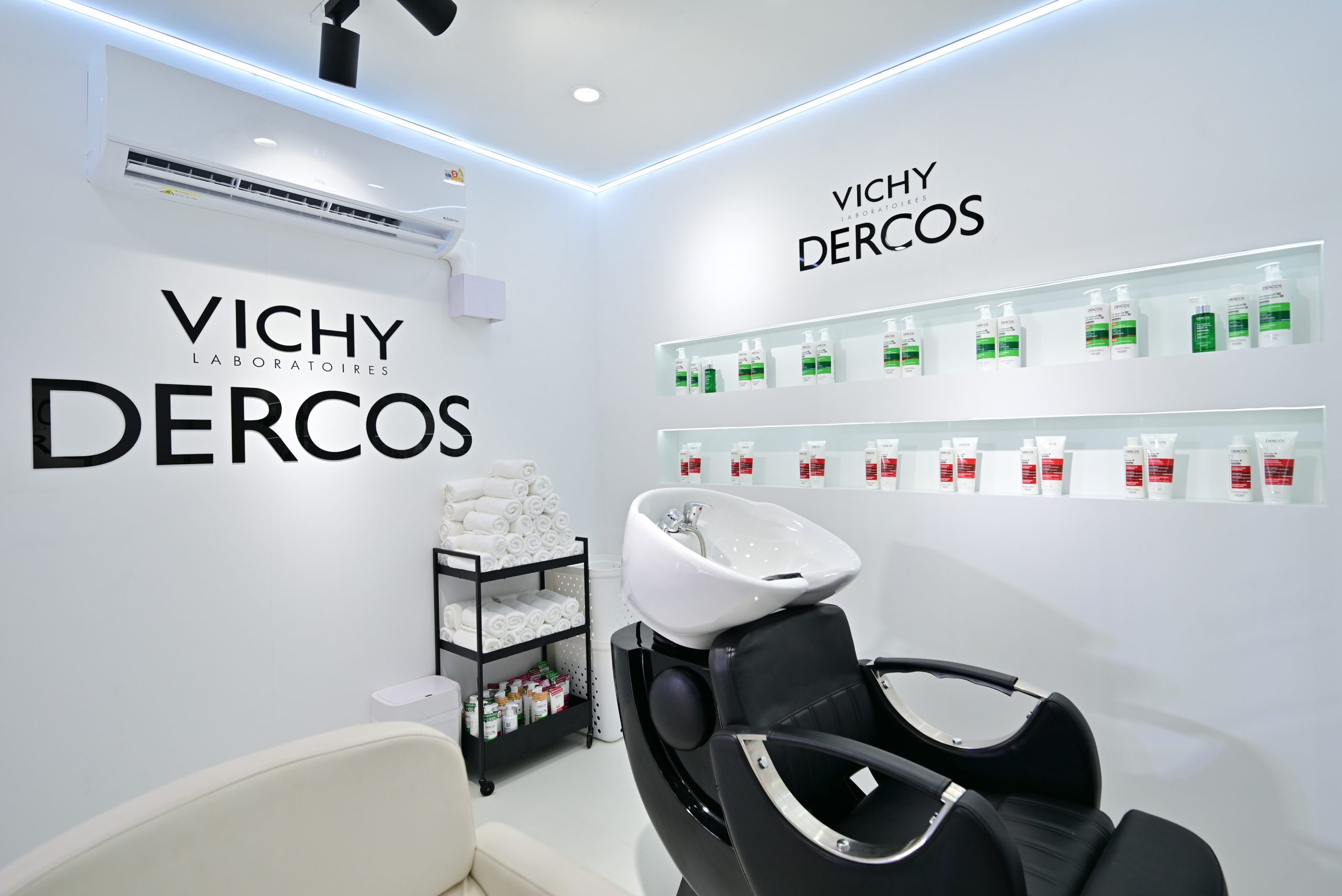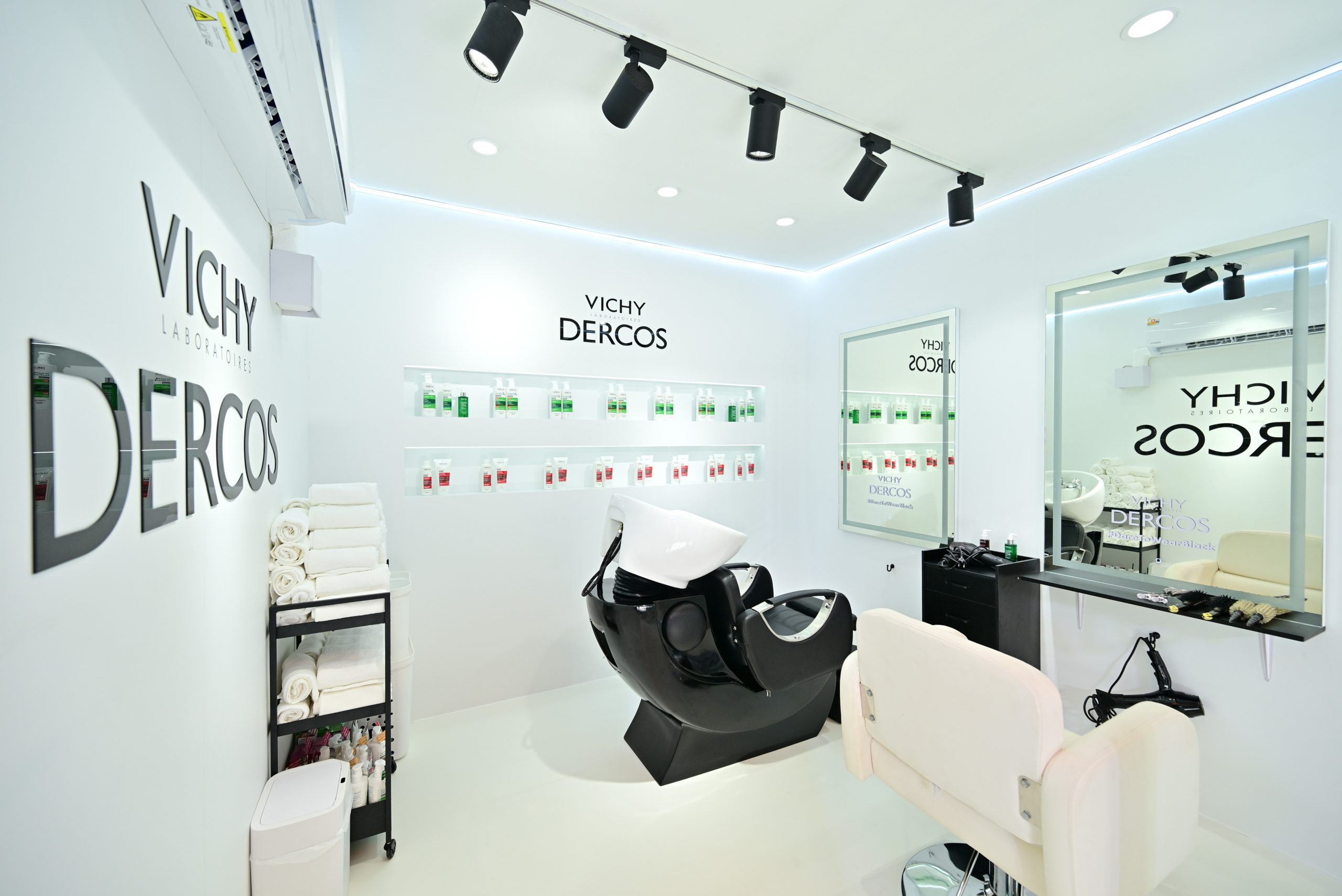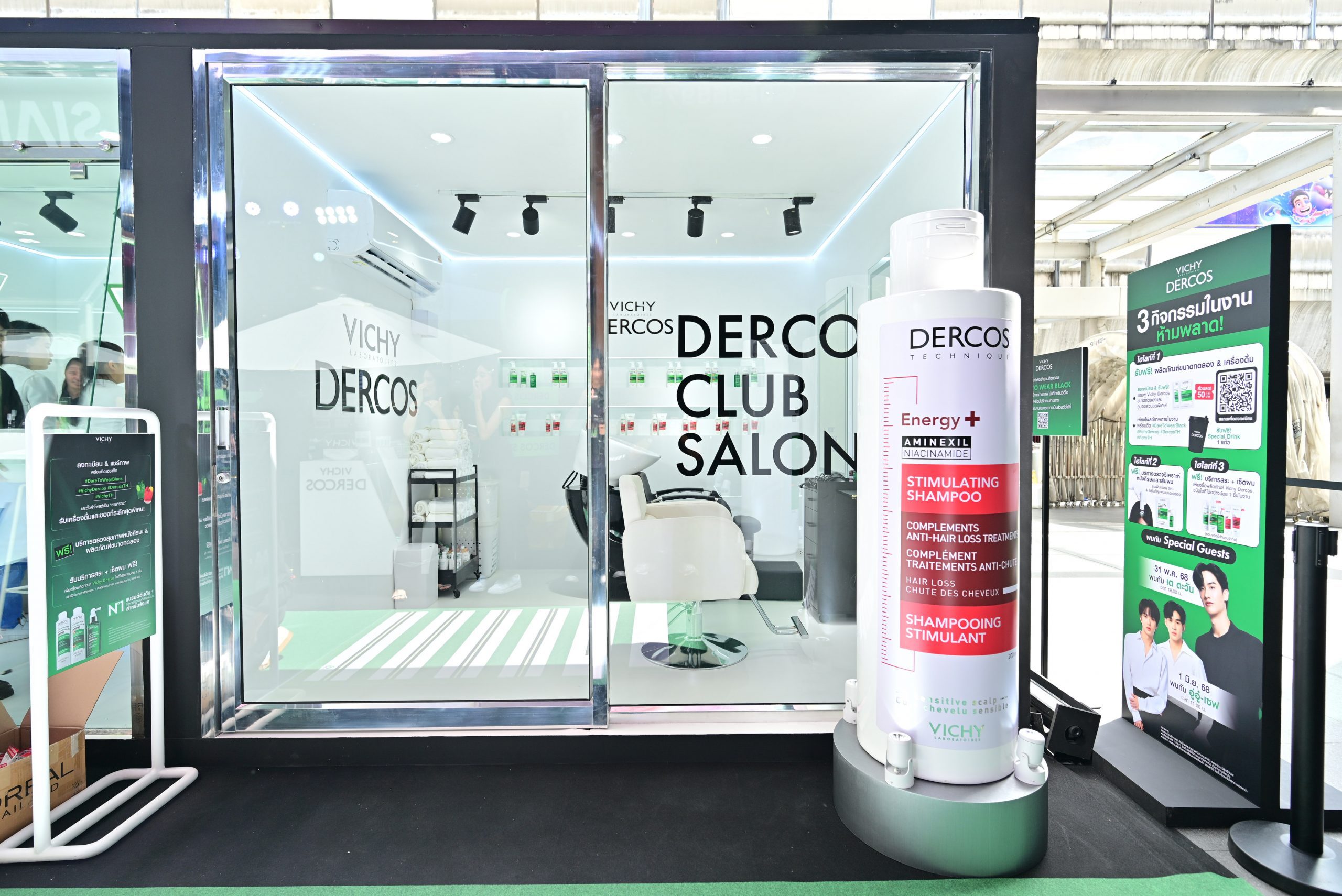 ก่อนจะเข้าสู่โซน Vichy Dercos Hair Experience ที่รายล้อมไปด้วยกลุ่มผลิตภัณฑ์ Vichy Dercos ทั้งไลน์ Anti-Dandruff สูตรสีเขียวขจัดรังแค Anti-Hairloss สูตรสีแดงสำหรับปัญหาผมขาดร่วง และ Densi-Solutions สูตรสีม่วงช่วยให้ผมมีวอลลุ่มดูหนาขึ้น ถัดมากับ Vichy Dercos Hair & Scalp Solution Center ที่ได้นำ Scalp Consult PRO เครื่องตรวจหนังศีรษะเฉพาะของ Vichy Dercos มาเปิดตัว พร้อมให้บริการตรวจวิเคราะห์หนังศีรษะและเส้นผมอย่างแม่นยำ ฟรี! เพื่อแนะนำแฮร์แคร์ที่ตอบโจทย์แต่ละบุคคลได้อย่างถูกต้อง รวมถึงรับผลิตภัณฑ์ขนาดทดลอง Vichy Dercos Anti-Dandruff 2-in-1 Shampoo + Conditioner และ Anti-Dandruff Serum 10 ฟรี! อีกทั้งยังมีโซน Vichy Dercos Club Salon ที่ให้บริการสระผม พร้อมเซ็ตผม ฟรี! เมื่อช้อปผลิตภัณฑ์ Vichy Dercos ใดๆ ภายในงาน 1 ชิ้น (สิทธิ์ / คิวมีจำนวนจำกัด) รวมถึงเอาใจสายคอนเทนต์กับโซนถ่ายรูปมากมาย ทั้ง Vichy Dercos V Shower, Studio และ Café เมื่อเช็กอินภาพชิคๆ พร้อมแชร์ลงโซเชียล รับฟรี! Special Drink เมื่อทำครบตามเงื่อนไข