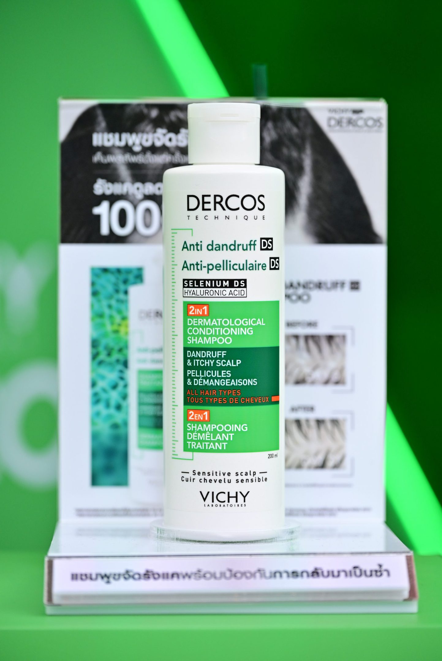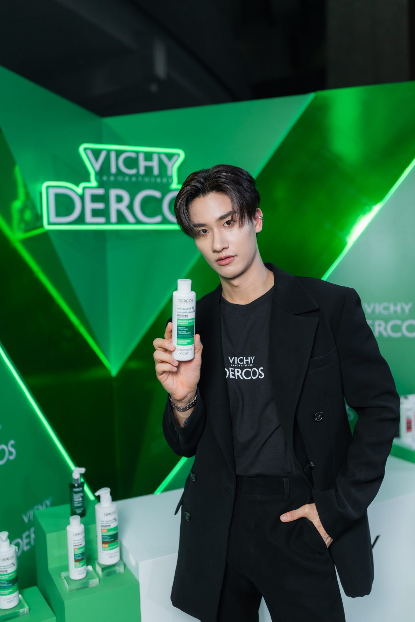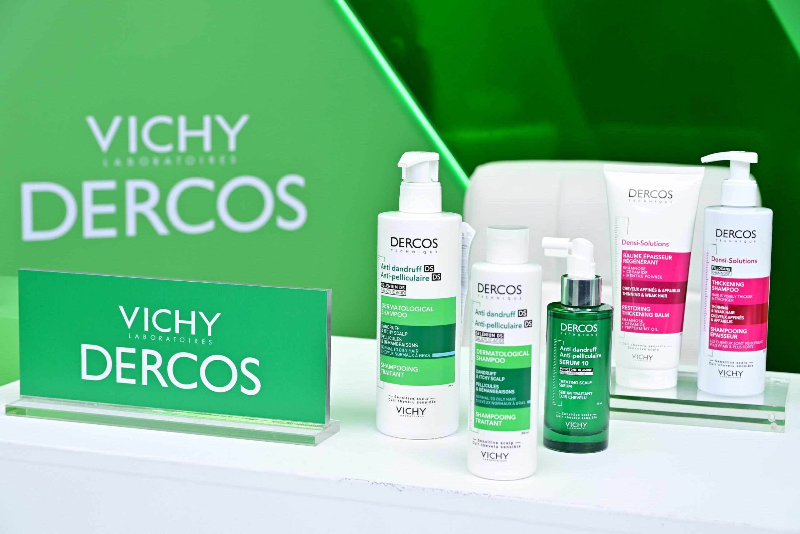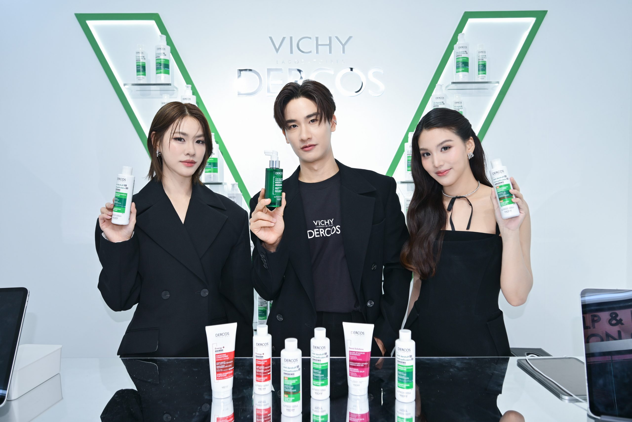 ไฮไลท์ของงานได้มีการเปิดตัวผลิตภัณฑ์ใหม่ Vichy Dercos Anti-Dandruff 2-in-1 Shampoo + Conditioner สูตรใหม่ ที่เพิ่มสารบำรุงใหม่ Hyaluron ช่วยขจัดรังแคสำหรับหนังศีรษะแห้งมากและผมเสียให้ผมสวยนุ่มยิ่งขึ้น โดยตั้งแต่ครั้งแรกที่ใช้** รังแคดูลดลง พร้อมบำรุงเส้นผมนุ่ม ชุ่มชื้น 72 ชม.*** ป้องกันรังแคกลับมาถึง 6 สัปดาห์^ , Anti-Dandruff Serum 10 ครั้งแรกของวิชี่กับนวัตกรรมเซรั่มขจัดรังแคจัดการครบ 10 ปัญหาหนังศีรษะที่สามารถใช้ได้กับผมทำสี ทั้งลดสะเก็ดรังแคที่เกาะติดและไม่เกาะติดหนังศีรษะ ลดความคัน ความมันส่วนเกิน ลดกลิ่นไม่พึงประสงค์ สร้างสมดุลความชุ่มชื้น ฟื้นปราการผิว ปกป้องและปลอบประโลมให้หนังศีรษะสบายขึ้น, Vichy Dercos Anti-Dandruff Shampoo 390 ml. ไซซ์ใหม่ใหญ่จุใจแถมคุ้มกว่าเดิม และ Vichy Dercos Anti-Hairloss Energy+ Fortifying Conditioner ครีมนวดใหม่จากกลุ่มสูตรสีแดงสำหรับปัญหาผมขาดร่วง นอกจากนี้ คุณเต – ตะวัน วิหครัตน์ Friend of Vichy Dercos นำทุกคนร่วมงานเพื่อเผยลุคดำมั่นใจไร้กังวลปัญหารังแค พร้อมด้วยนักแสดงชื่อดัง อาทิ คุณเอมี่ – ทสร กลิ่นเนียม และ คุณบอนนี่ – ภัทราภัสร์ โบรัชตะสุวรรณ์ ในครั้งนี้
