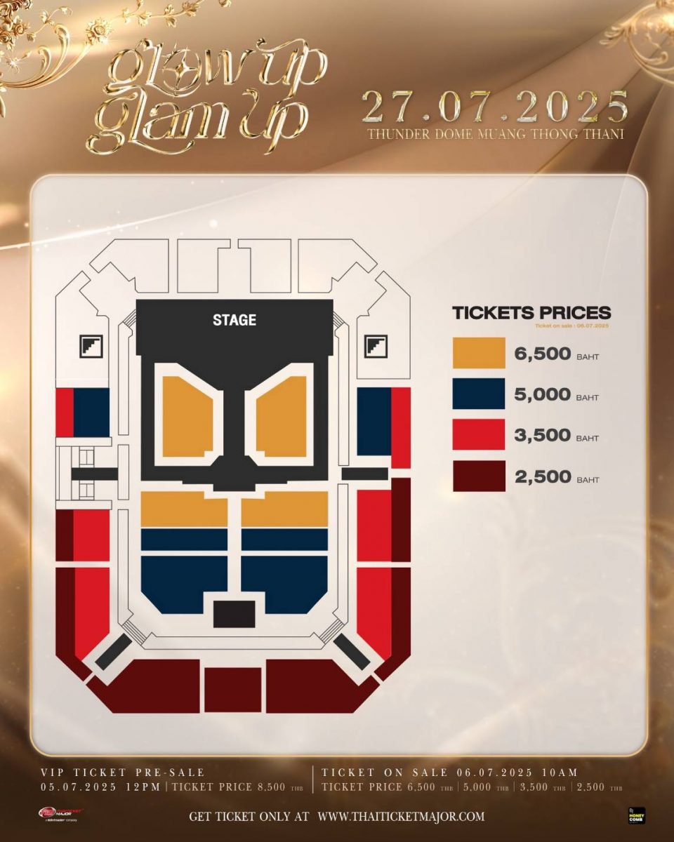 พิเศษ! สุดๆ สำหรับบัตร VIP เปิดให้พรีเซลล์ก่อนใครทางออนไลน์ www.thaiticketmajor.com เท่านั้น ในวันเสาร์ 5 กรกฎาคม 2568 เวลา 12:00 น. และสำหรับบัตรทุกโซนจะเปิดจำหน่ายอีกครั้งทุกช่องทางของ thaiticketmajor ในวันอาทิตย์ที่ 6 กรกฎาคม 2568 เวลา 10:00 น. บัตรราคา 6,500 / 5,000 / 3,500 และ 2,500 บาท พร้อมเบเนฟิตฉ่ำๆ อย่างแน่นอน