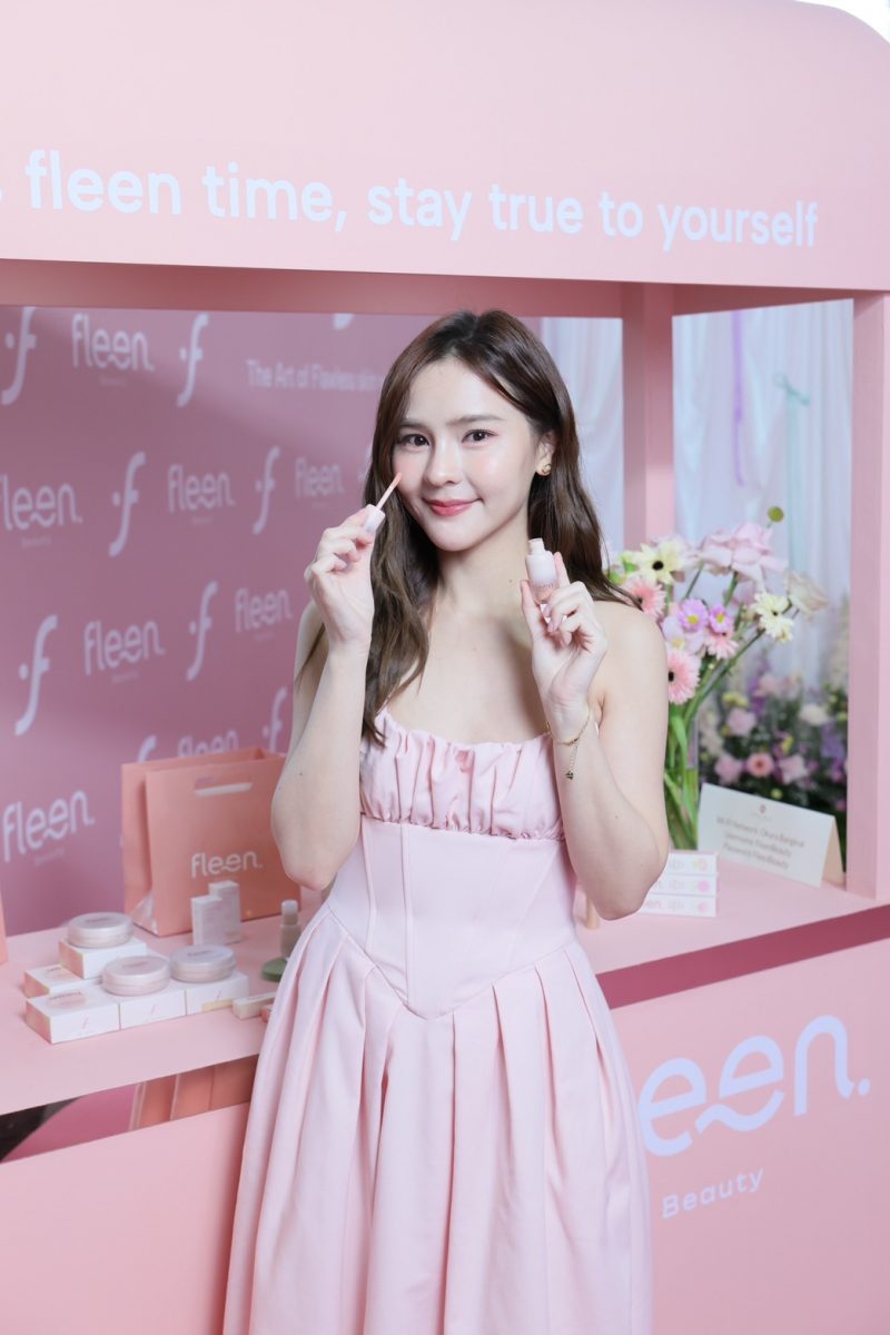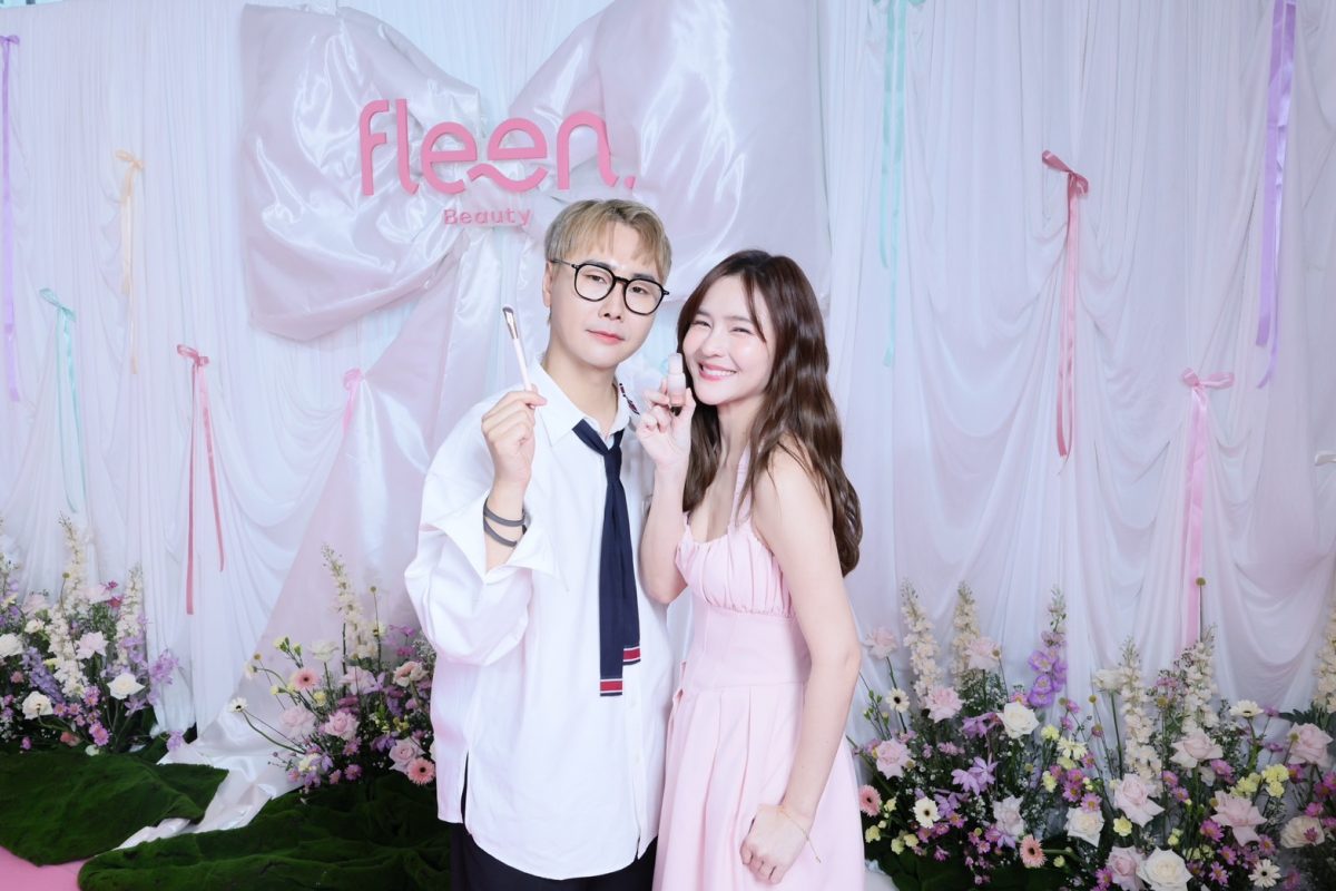งานนี้ ออม-สุชาร์ เล่าให้ฟังว่า “Fleen Beauty มาจากที่ออมเป็นคนที่มีผิวหน้าแห้ง จึงมองหาผลิตภัณฑ์สกินแคร์มาบำรุงทั้งก่อนและหลังแต่งหน้า เพื่อให้ผิวมีความชุ่มชื้น และคิดว่าผู้หญิงก็น่าจะมีปัญหาเหมือนกัน ซึ่งฟลีน บิวตี้ เป็นแบรนด์ที่ออมตั้งใจทำขึ้นมาไม่ใช่เป็นแค่เมคเป็นอัพเท่านั้น แต่เป็นเครื่องสำอางที่ผสานสกินแคร์เพื่อช่วยบำรุงผิวหน้าระหว่างวัน เพราะการแต่งหน้าออกจากบ้านเครื่องสำอางจะต้องอยู่บนหน้าเราเฉลี่ยนานถึง 12 – 14 ชั่วโมงต่อวัน ยังไม่นับที่เราต้องคอยเติมระหว่างวันด้วย เลยคิดว่าถ้าในเครื่องสำอางที่เราใช้ทุกวันมีตัวที่ช่วยบำรุงผิวหน้าเราไปพร้อมกับเมคอัพน่าจะดี จึงคิดค้นพัฒนาสูตรกับทีมวิจัยและพัฒนาเพื่อให้ได้ผลิตภัณฑ์ที่ดีที่สุด จนได้ออกมาเป็น 5 ผลิตภัณฑ์ ได้แก่ น้องใหม่ล่าสุด! Fleen Beauty Skin Caring Corrector และ Fleen Beauty Hya Plumping Concealer ตัวช่วยสำหรับสาว ๆ ที่มีใบหน้าหมองคล้ำที่ช่วยปรับสภาพผิวและปกปิดเฉพาะสุดให้เรียบเนียน นอกจากนี้ยังมีผลิตภัณฑ์ตัวท็อปในโซเชียลกับ Fleen Beauty Energize Tone Up Serum ขั้นตอนแรกที่ทำให้ผิวหน้าชุ่มชื้นและกระจ่างใส, Fleen Beauty Youth Up Aqua Covering Pact คุชชั่นผสมน้ำแร่ธรรมชาติจากเกาะเชจูประเทศเกาหลี พร้อมปกป้องจากแสงแดดด้วย SPF50 PA+++, Fleen Beauty Soft Velvet Fluffy Cheek บลัชออนเนื้อครีมที่เปลี่ยนเป็นแป้งบางเบากับสีสดใสน่ารัก และถ้าได้คอมพลีทลุคกับลิปสติกสีเดียวกับบรัชออนจะเสริมความมั่นใจให้กับสาว ๆ ก่อนออกจากบ้านได้เต็มร้อย