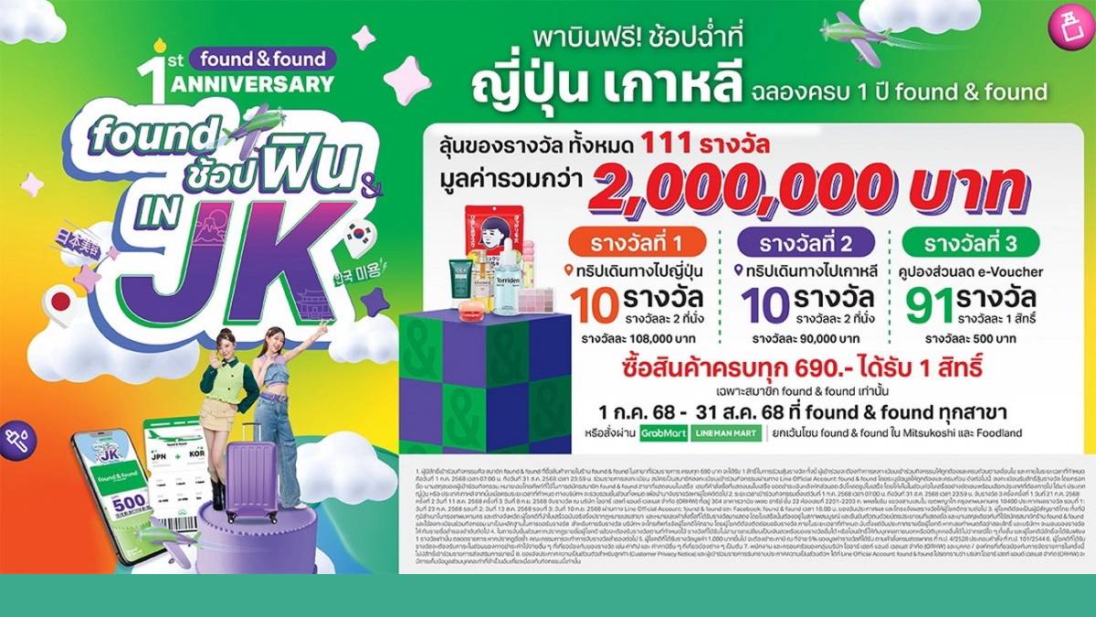 “found & found” บิวตี้เดสติเนชันสินค้าความงามจากญี่ปุ่น–เกาหลี ส่งแคมเปญพิเศษฉลองครบรอบ 1 ปี ชวนนักช้อปร่วมลุ้น บินลัดฟ้าฟรี ช้อปฉ่ำที่ ญี่ปุ่น เกาหลี กับเที่ยวบิน “found ช้อปฟิน IN JK” และลุ้นรับ ของรางวัลอื่นๆ อีกมากมาย เพียงซื้อสินค้าที่ร่วมรายการในร้าน found & found ครบทุก 690 บาท จะได้ลุ้น 1 สิทธิ์ ยิ่งซื้อเยอะ ยิ่งมีสิทธิ์เยอะ ร่วมเป็นหนึ่งในผู้โชคดีลุ้นรับของรางวัลกว่า 111 รางวัล รวมมูลค่ากว่า 2,000,000 บาท สามารถร่วมสนุกลุ้นรับโชคกับแคมเปญนี้ได้ ตั้งแต่วันที่ 1 ก.ค.-31 ส.ค. 2568 นี้เท่านั้น