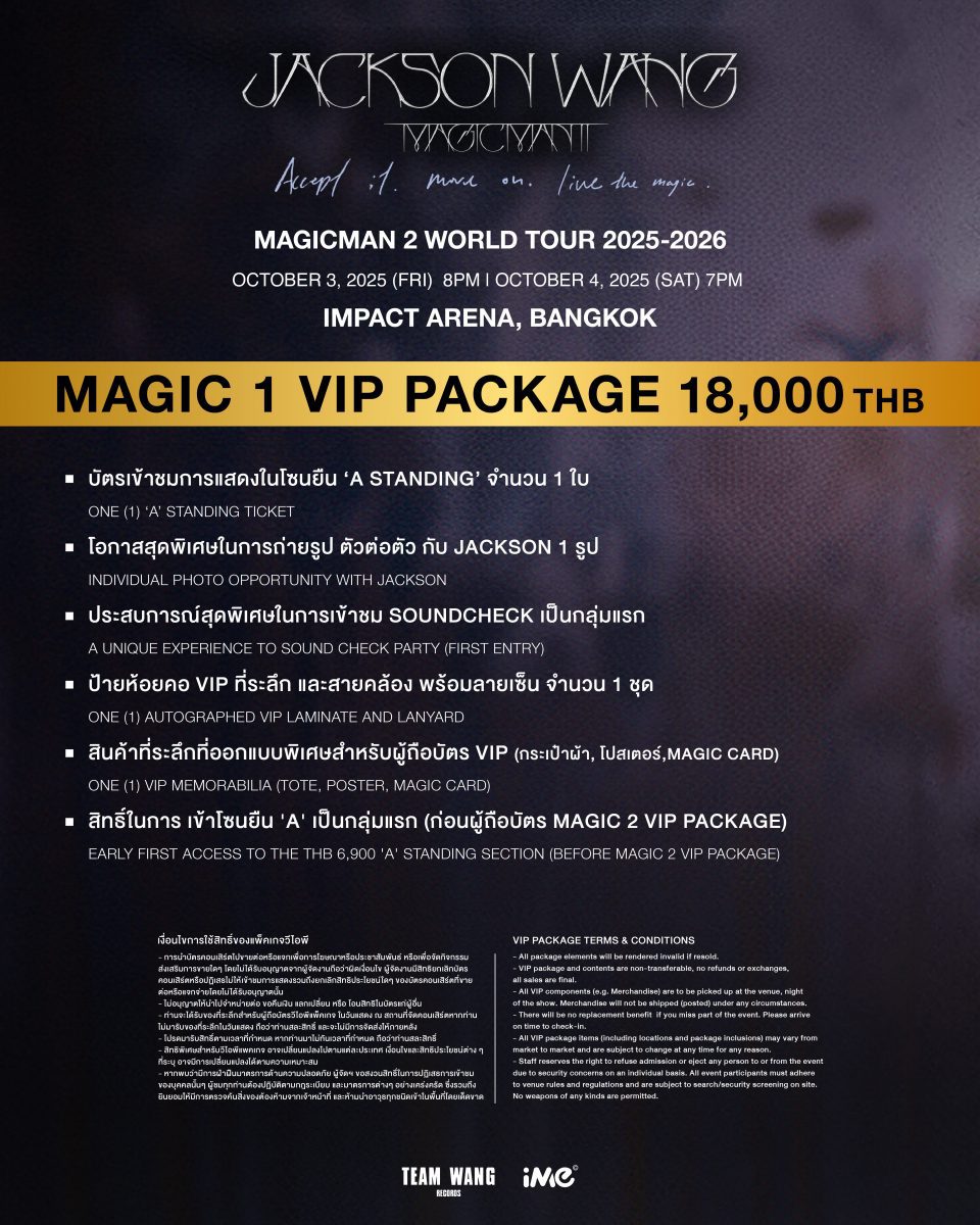 ถึงเวลารีเช็คความพร้อม!?! กับปรากฏการณ์ครั้งใหม่ที่แฟนๆ รอคอย “MAGIC MAN IS BACK!!” การกลับมาอย่างยิ่งใหญ่ของจักรวาล MAGICMAN 2 พร้อมเปิดฉากความมันส์ให้เดือดระอุกับ ‘เมจิกแมน’ สุดเท่ “แจ็คสัน หวัง” (Jackson Wang) หรือที่แฟนคลับชาวไทยเรียกกันอย่างเอ็นดูว่า “พี่แจ็ค” ครั้งนี้เขากลับมาพร้อมเวิลด์ทัวร์คอนเสิร์ตใหญ่เต็มรูปแบบ และโชว์ที่ยกระดับทั้งด้านโปรดักชันและพลังการแสดงให้เหนือกว่าทุกครั้งที่ผ่านมา สำหรับเวิลด์ทัวร์ MAGICMAN 2 ครั้งนี้เปิดฉากด้วย 6 เมือง ประเดิมประเทศไทยเป็นเมืองแรก ก่อนจะเดินทางต่อไปยัง มาเก๊า, จาการ์ตา, กัวลาลัมเปอร์, มะนิลา และโตเกียว พร้อมประกาศเมืองเพิ่มเติมอีกเร็ว ๆ นี้ ซึ่งแน่นอนว่าแฟน ๆ ชาวไทยเตรียมตัวให้พร้อมกับงาน MAGICMAN 2 WORLD TOUR 2025-2026 in Bangkok Presented by Galaxy Resorts Thailand กันได้เลย งานนี้จัดเต็ม 2 รอบการแสดงสุดยิ่งใหญ่ ในวันศุกร์ที่ 3 ตุลาคม 2568 เวลา 20.00 น. และวันเสาร์ที่ 4 ตุลาคม 2568 เวลา 19.00 น. ณ อิมแพ็ค อารีน่า เมืองทองธานี โดยผู้จัด iMe Thailand ทุ่มทุนสร้างโปรดักชั่นระดับโลกที่ผู้ชมจะลืมไม่ลง
