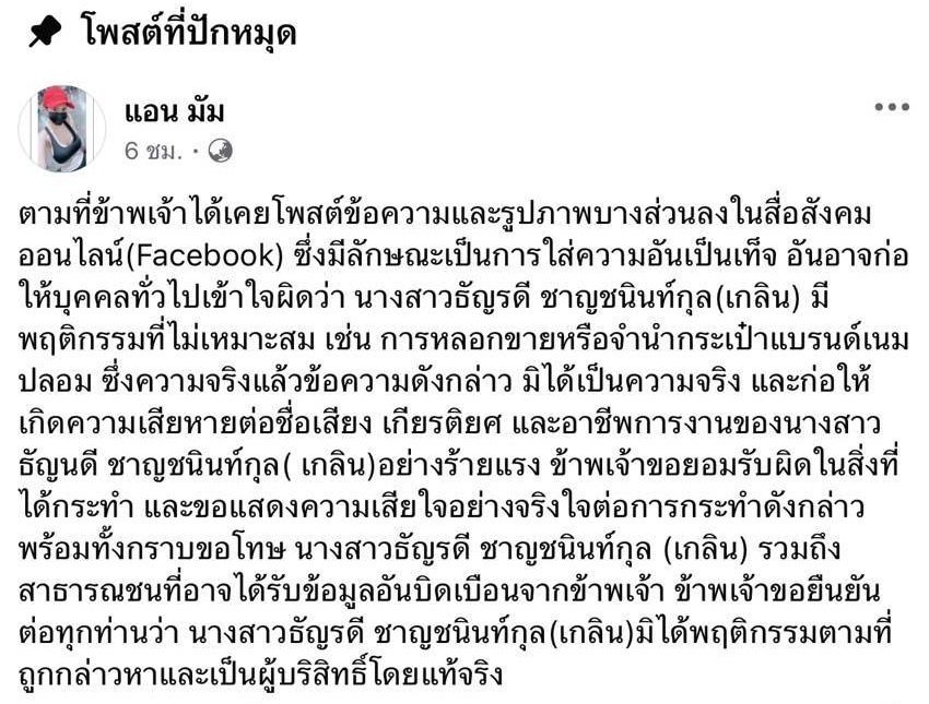 ตามที่ตลอดระยะเวลากว่า 1 ปีที่ผ่านมา นางสาวธัญรดี ชาญชนินท์กุล หรือ เกลิน ธัญรดี นักแสดง ได้ถูกใส่ร้ายและเผยแพร่ข้อความอันเป็นเท็จในสื่อสังคมออนไลน์ จนส่งผลกระทบต่อชื่อเสียง เกียรติยศ และภาพลักษณ์ทางอาชีพ