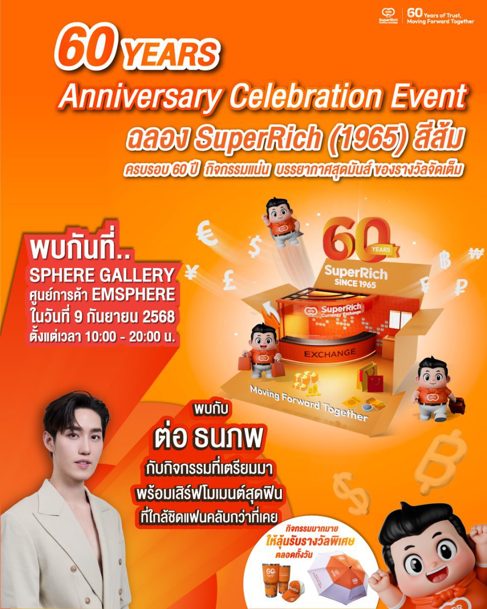 บริษัท ซุปเปอร์ริช เคอเรนซี่ เอ็กซ์เชนจ์ (1965) จำกัด หรือ “ซุปเปอร์ริช (1965) สีส้ม” ผู้นำอันดับ 1 ด้านการแลกเปลี่ยนเงินตราต่างประเทศ (No.1 Currency Exchange) ขอเชิญร่วมงานฉลองครบรอบ 60 ปี เพื่อขอบคุณลูกค้าที่ให้ความไว้วางใจในความซื่อสัตย์ ความโปร่งใส และความเชื่อถือที่มีต่อซุปเปอร์ริชสีส้มมาตลอด 6 ทศวรรษ ภายใต้คอนเซปต์ “60 Years of Trust, Moving Forward Together” เพื่อก้าวต่อไปอย่างมั่นใจไปด้วยกัน พร้อมเปิดประสบการณ์ใหม่ ๆในการแลกเปลี่ยนเงินตราต่างประเทศที่ยกระดับทุกการเดินทาง ให้สะดวกสบายและปลอดภัยยิ่งขึ้น พบกับกิจกรรมสนุก ๆ และความบันเทิงแบบจัดเต็มตลอดทั้งวัน ลุ้นรับของรางวัลสุดพิเศษมากมาย ปิดท้ายด้วยกิจกรรม Meet & Greet สุดใกล้ชิด และมินิคอนเสิร์ตจาก “ต่อ–ธนภพ ลีรัตนขจร” ที่จะมอบโมเมนต์สุดฟินและใกล้ชิดแฟนคลับกว่าที่เคย