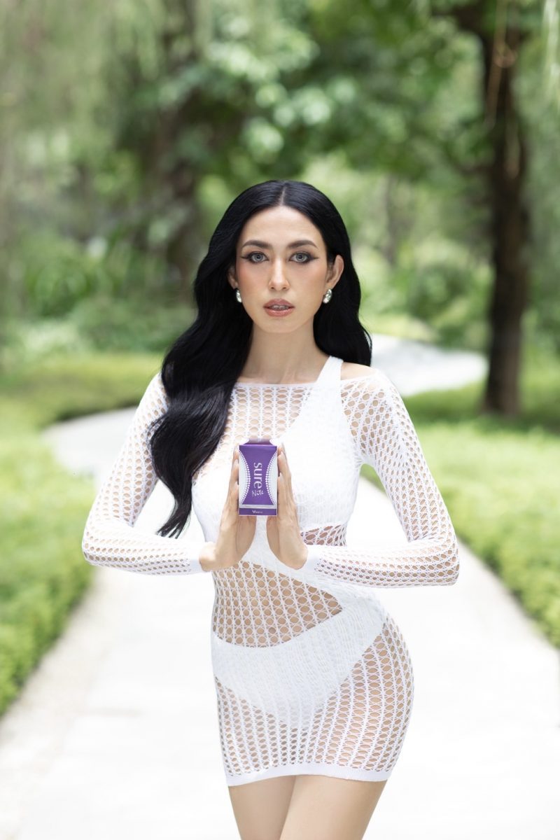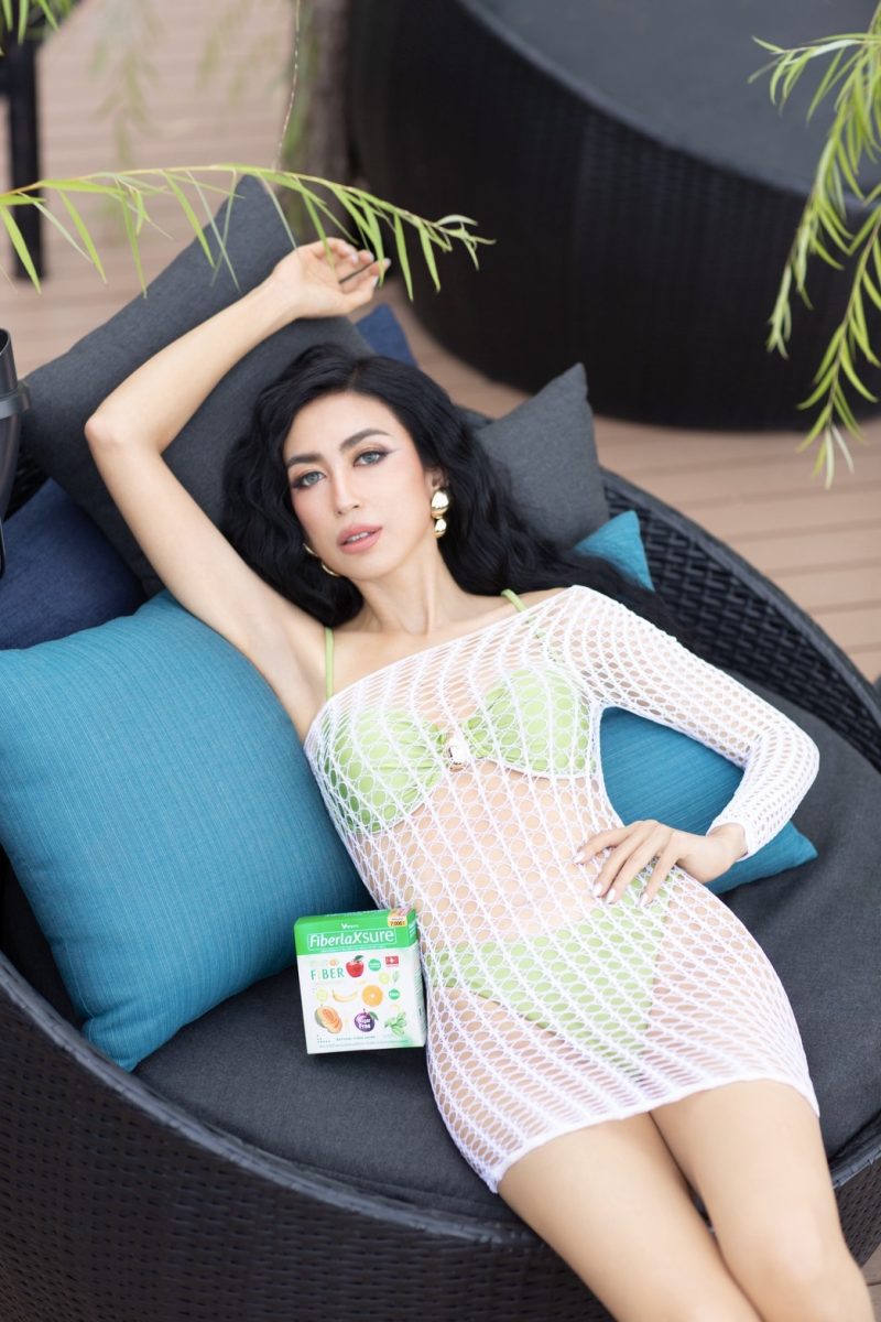 “ด้วยความที่เราอายุใกล้ 50 แล้ว เราก็ไม่ได้ถ่ายชุดว่ายน้ำมานานมากแล้ว เกือบ 30 ปีอยู่ในวงการมา เคยถ่ายสมัยเป็นวัยรุ่น เข้าวงการใหม่ๆ เลย และไม่เคยถ่ายอีกเลย พอตอนนี้เรามั่นใจในรูปร่างของตัวเอง ด้วยความอายุก็ใกล้จะ 50 ก็คิดว่าหลังจากนี้คงไม่มีโอกาสได้ถ่ายอีกแล้ว ตอนนี้เราได้กินผลิตภัณฑ์ทั้งสามตัวนี้ มันทำให้เรามีความมั่นใจมากขึ้น และเรามีการไปตรวจด้วยหลังเราทานผลิตภัณฑ์มา เราไปตรวจว่าตอนนี้ในร่างกายเรามีไขมันอยู่เท่าไหร่ มีไขมันเยอะหรือน้อย ปรากฏว่าทุกอย่างอยู่ในเกณฑ์ดีหมดเลย ไปตรวจมาน้ำในร่างกายก็อยู่ในเกณฑ์ดี กล้ามเนื้อก็อยู่ในเกณฑ์ดี แต่ที่เหลือน้อยมากๆ คือไขมัน มันเลยยิ่งทำให้เรามั่นใจว่าถ้าเราไม่ถ่ายชุดว่ายน้ำตอนนี้ ก็ไม่รู้จะถ่ายชุดว่ายน้ำตอนไหนแล้ว เพราะอายุเราใกล้จะ 50 แล้ว”