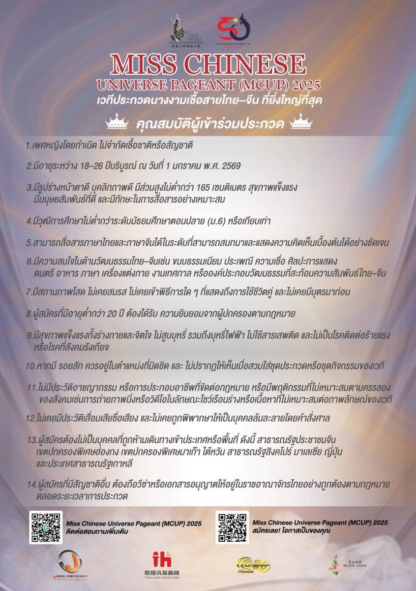เนื่องในวาระครบรอบ 50 ปี ความสัมพันธ์ทางการทูตไทย–จีน บริษัท ไทยเจียระไนกรุ๊ป จำกัด (มหาชน) ผู้เชี่ยวชาญด้านการตลาดจีนและเจ้าของสื่อภาษาจีนรายใหญ่ ที่ช่วยเชื่อมโยงธุรกิจไทยให้เข้าถึงผู้บริโภคชาวจีนได้อย่างมีประสิทธิภาพ จัดงานแถลงข่าวการประกวดสาวงามระดับนานาชาติครั้งยิ่งใหญ่ในประเทศไทย “Miss Chinese Universe Pageant (MCUP) 2025 หรือ มิส ไชนีส ยูนิเวิร์ส เพเจ้นท์ 2025 ณ SPHERE GALLERY ชั้น 2 ศูนย์การค้าเอ็มสเฟียร์ (EMSPHERE) เมื่อวันที่ 16 กันยายน พ.ศ. 2568 ที่ผ่านมา