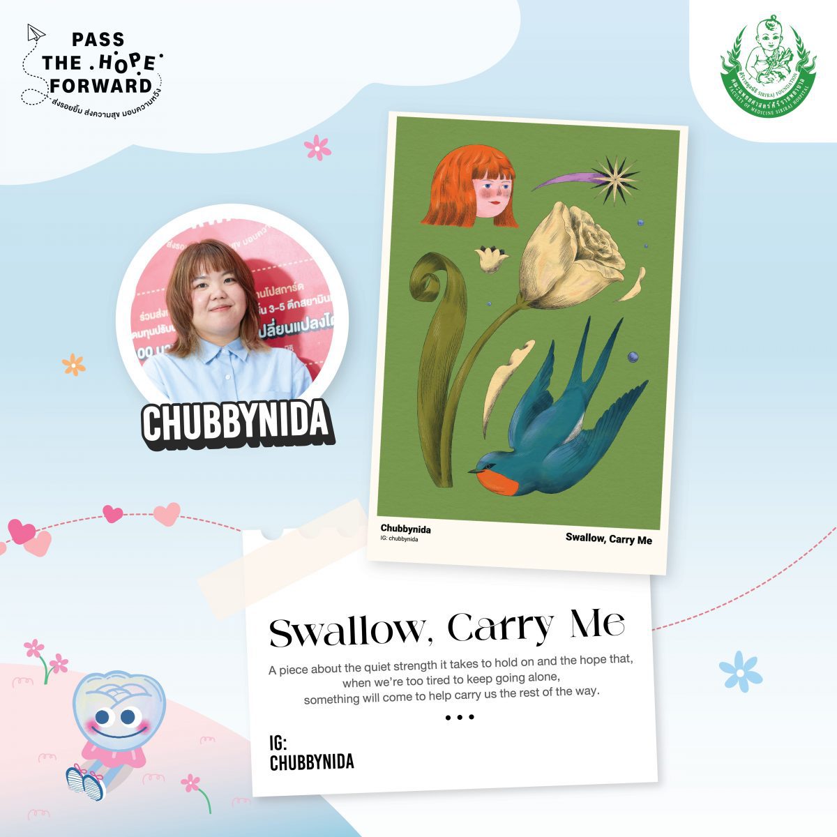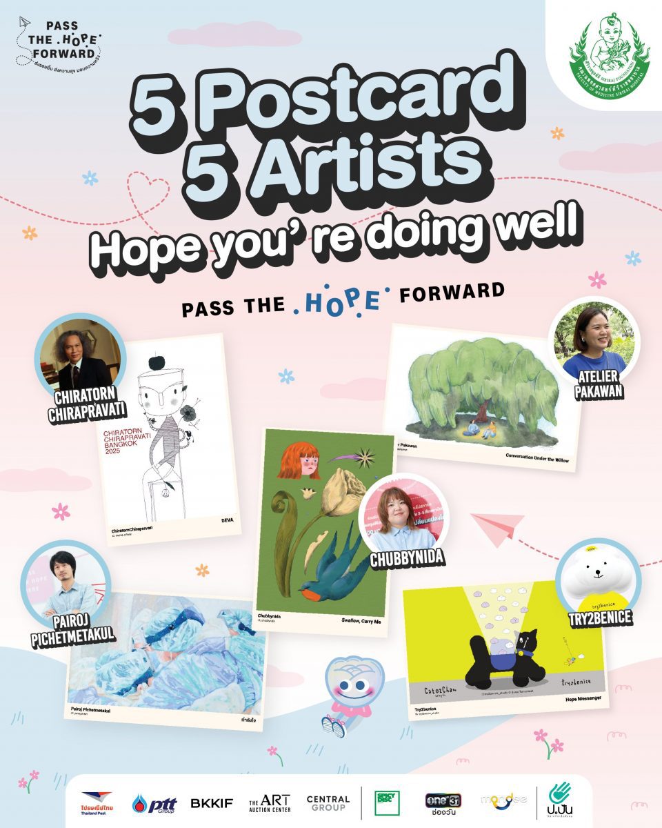โครงการ ‘Pass the Hope Forward’ ส่งรอยยิ้ม ส่งความสุข มอบความหวัง โดย ศิริราชมูลนิธิ, บอย โกสิยพงษ์, ไปรษณีย์ไทย และ ป.ปัน วิสาหกิจเพื่อสังคม ร่วมกับ Bangkok Illustrator Fair (BKKIF) ชวน 20 ศิลปินไทยจิตอาสา มาร่วมออกแบบโปสการ์ดสุดพิเศษจำนวน 20 แบบ ล่าสุดกับการเปิดตัว “Postcard Set 3 – Hope You’re Doing Well” ในช่วงเดือนสิงหาคม 2568 จาก 5 ศิลปินชื่อดัง นำโดย ‘ครูโต’ ม.ล.จิราธร จิรประวัติ, ป๊อก-ไพโรจน์ พิเชฐเมธากุล, อาท-สุรัติ โตมรศักดิ์ หรือ Try2benice , นิดา หรือ Chubbynida และ ภควรรณ ทองวานิช หรือ Atelier Pakawan โดยใน Set 3 นี้ เปิดตัวมาพร้อมกับ ‘น้องมะลิ’ ที่เปรียบเสมือนตัวแทนของความห่วงใย และความอ่อนโยน และ Special Card “Bingo Wellness” เป็นกิจกรรมเพื่อส่งเสริมสุขภาพและความเป็นอยู่ที่ดี และหวังว่าทุกคนที่ได้รับโปสการ์ดเซ็ตนี้จะรู้สึกถึงความปรารถนาดีเล็ก ๆ จากใครสักคนที่อยากบอกว่า ‘ขอให้เธอสบายดีนะ’ คำทักทายง่าย ๆ ที่อาจเปลี่ยนวันที่เหนื่อยล้า ให้กลับมามีความหวังอีกครั้ง ผ่านแนวคิดของ 5 ศิลปิน