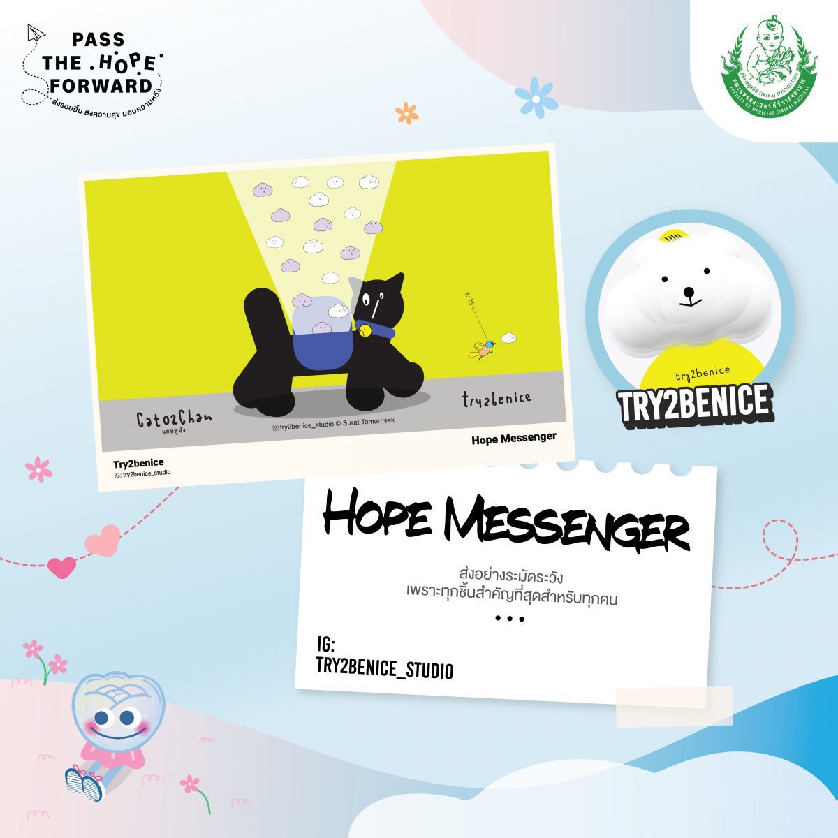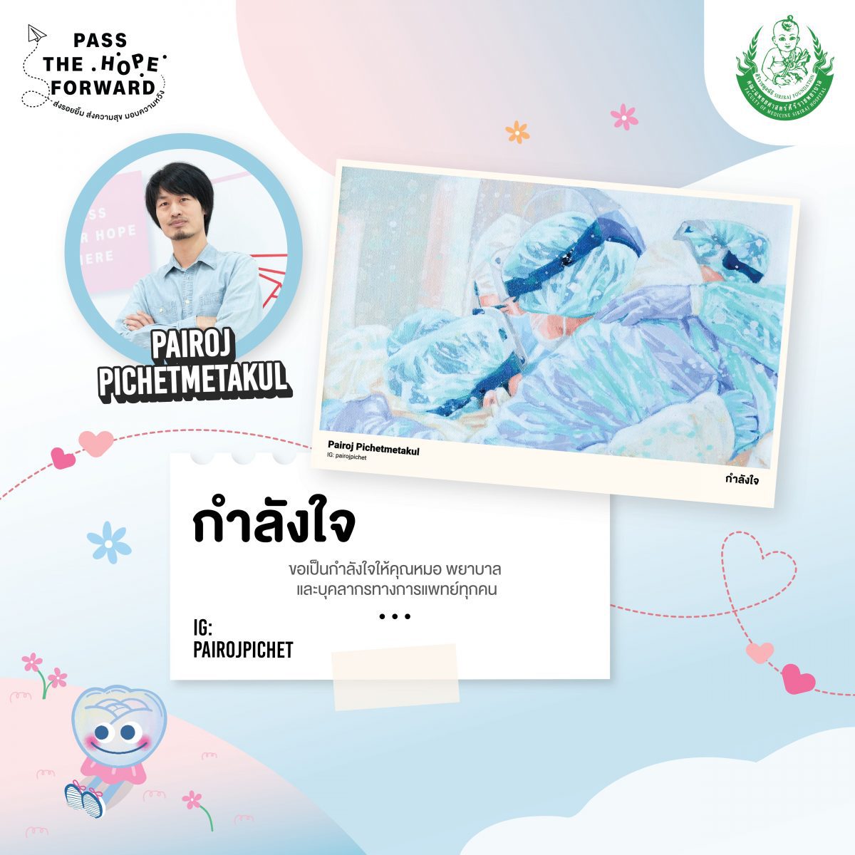 ร่วมส่งรอยยิ้ม ส่งความสุข มอบความหวัง #PassTheHopeForward ผ่านโปสการ์ดชุด Postcard Set 3 – Hope You’re Doing Well ในราคา 100 บาท *ไม่สามารถนำไปลดหย่อนภาษีได้ โดยรายได้ทั้งหมดหลังหักค่าใช้จ่ายจะนำไปสมทบกองทุนห้องผ่าตัดศิริราช ชั้น 3-5 ตึกสยามินทร์ โรงพยาบาลศิริราช เริ่มจำหน่ายตั้งแต่ วันนี้เป็นต้นไป ผ่านช่องทาง LINE OA : @PPUNSE หรือ https://lin.ee/MEovwwP