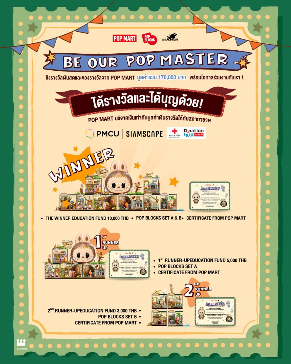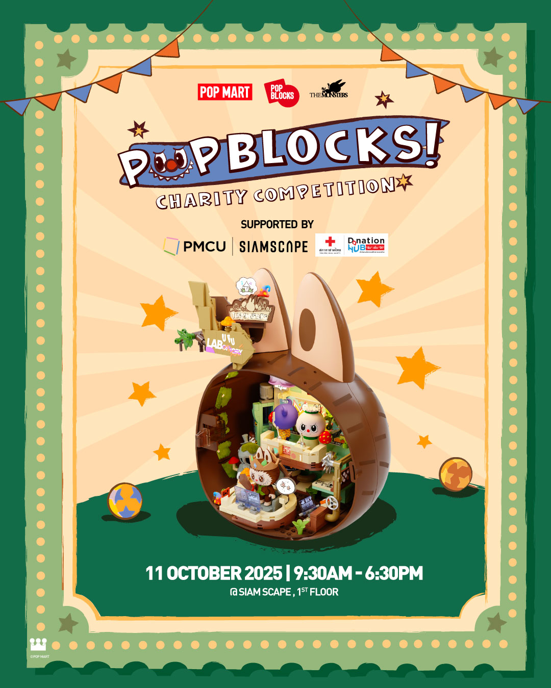 ขอเชิญน้องๆ วัยทีน 15-17 ปี ลงแข่งขัน POP BLOCKS Charity Competition โดยไม่มีค่าใช้จ่ายใดๆ กิจกรรมดีๆ สำหรับเยาวชนไทย และงานนี้ยังได้สมทบทุนทำบุญอีกด้วย สนใจสมัคร ดูรายละเอียด ได้ที่เฟซบุ๊กแฟนเพจ POP MART THAILAND