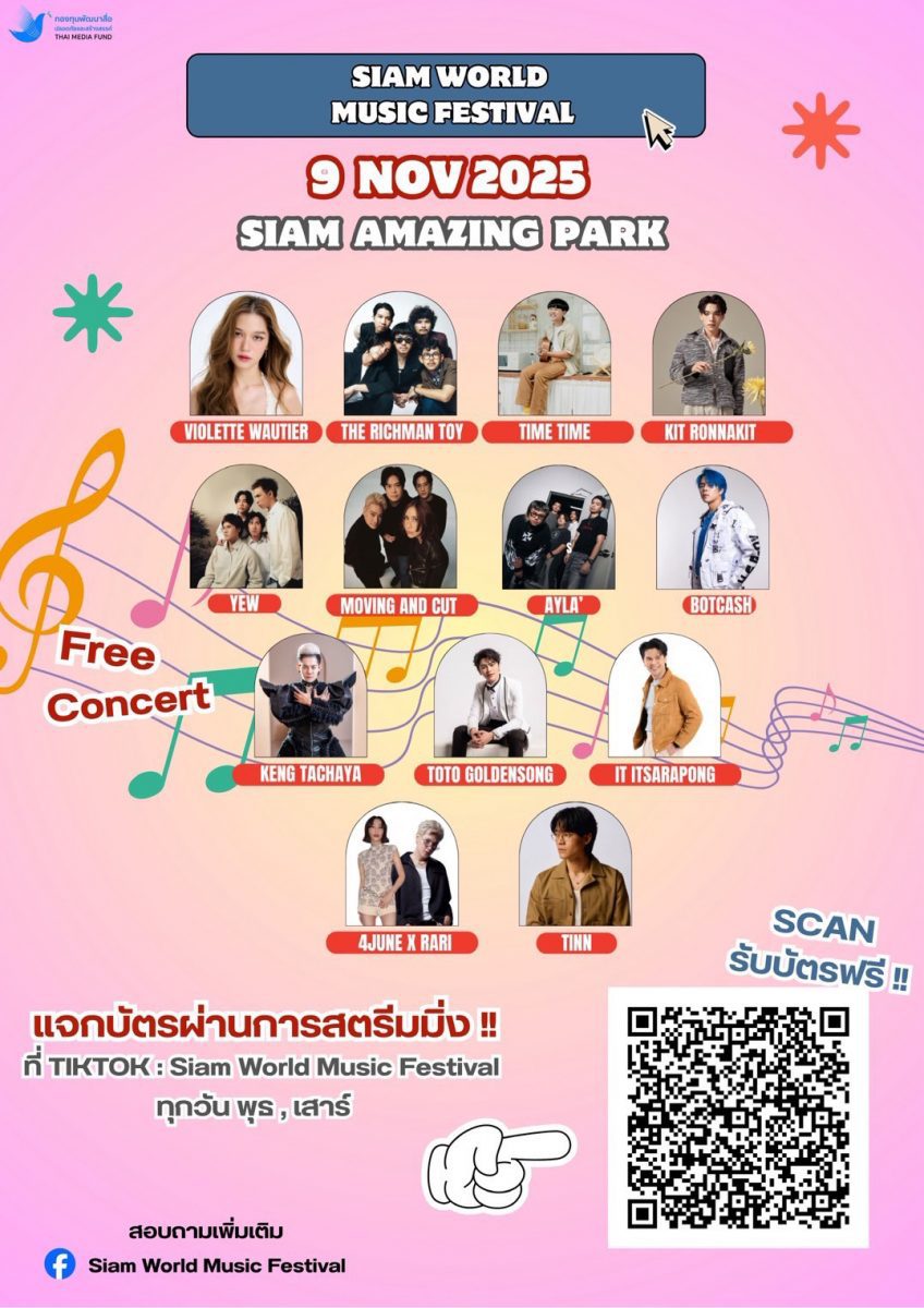 คุณณัฐรัชต์ จิระพลพนิต หัวหน้าโครงการ Siam World Music Festival เปิดเผยว่า งาน “Siam World Music Festival 2025” เทศกาลดนตรีและวัฒนธรรมสุดยิ่งใหญ่ เป็นฟรีคอนเสิร์ต ที่ได้รับการสนับสนุนจาก สำนักงานกองทุนพัฒนาสื่อปลอดภัยและสร้างสรรค์ เพื่อสร้างเวทีที่ผสมผสานพลังของดนตรี ศิลปะ และการท่องเที่ยวเข้าไว้ด้วยกันอย่างกลมกลืน นับได้ว่าเป็นการรวมตัวของศิลปินแนวหน้าของประเทศ ที่จะทำให้งานเทศกาลครั้งนี้เปี่ยมไปด้วยสีสันดนตรีที่หลากหลาย ตั้งแต่ไทย ป๊อปร็อก อินดี้ ไปจนถึงอิเล็กทรอนิกส์ และโชว์ที่ผสมผสานความร่วมสมัย