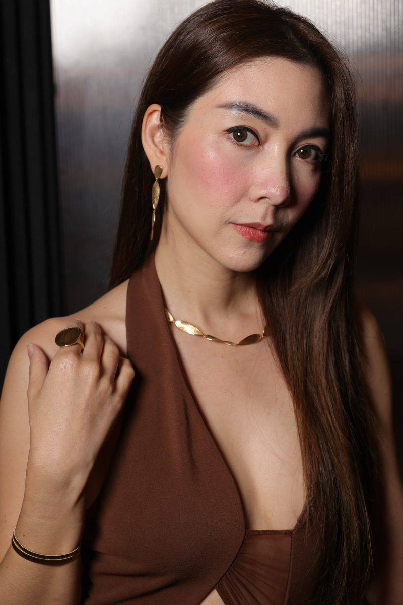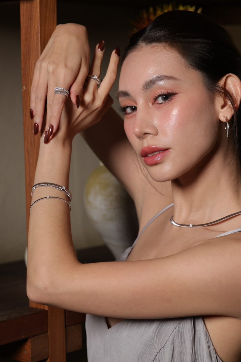 ที่จะเลือก กำไล ต่างหู และแหวน สี Yellow Gold จากคอลเลกชัน Lunaria มาคอมพลีทลุคสุดปัง ปิดท้ายด้วยสาวสายแฟอย่าง ดาว-พิมพ์ทอง มาในแมกซี่เดรสยาว โทนเทาอ่อน เพิ่มลูกเล่นด้วยจิวเวลรี่ครบเซ็ต ไม่ว่าจะเป็น สร้อยคอ กำไล