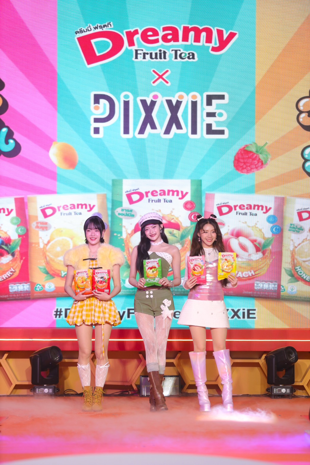 ในงานเปิดตัว “Dreamy Fruit Tea : Fruit Fun Fresh” ที่จัดขึ้นเมื่อวันที่ 24 ตุลาคม 2568 ณ ศูนย์การค้ายูเนี่ยน มอลล์ บริษัทฯ ได้รับเกียรติจากศิลปินเกิร์ลกรุ๊ปสุดฮอต “PiXXiE” — มาเบล, พิมมา และอิงโกะ — มารับหน้าที่ พรีเซนเตอร์ พร้อมมินิคอนเสิร์ตสุดพิเศษที่สร้างสีสันและพลังสดชื่นให้กับผู้ร่วมงาน นอกจากนี้ยังมีโชว์สุดประทับใจจากบาร์เทนเดอร์มืออาชีพ และดีเจนุ้ย ธนวัฒน์ ประสิทธิสมพร มาร่วมสร้างความสนุกอย่างคับคั่ง