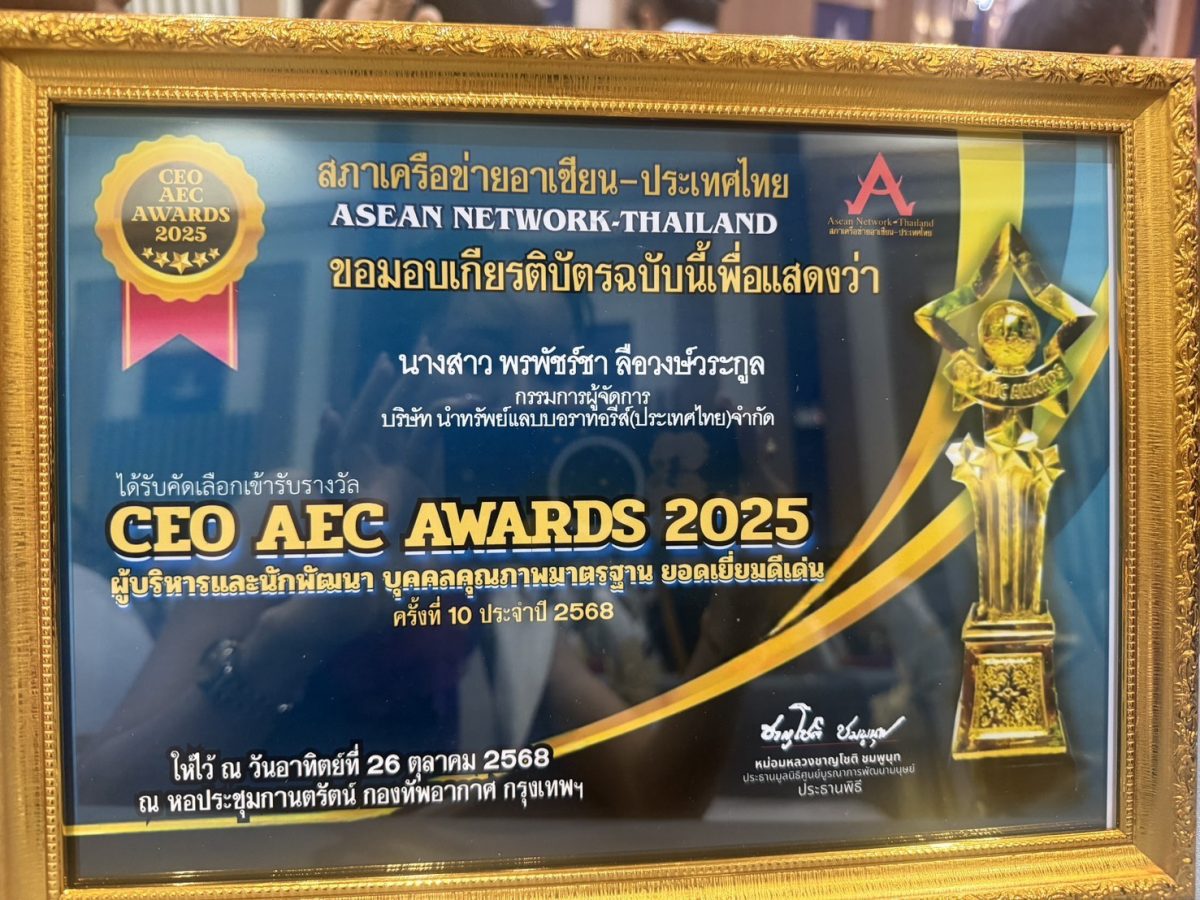 บริษัทนำทรัพย์แลบบอราทอรีส์ (ประเทศไทย) จำกัด นำโดย คุณพรพัชร์ชา ลือวงษ์วระกูล กรรมการผู้จัดการ เข้ารับ รางวัลเกียรติยศ “CEO AEC Awards 2025” ในสาขา ผู้บริหารและนักพัฒนา บุคคลคุณภาพมาตรฐาน ยอดเยี่ยมดีเด่น ครั้งที่ 10 ประจำปี 2568