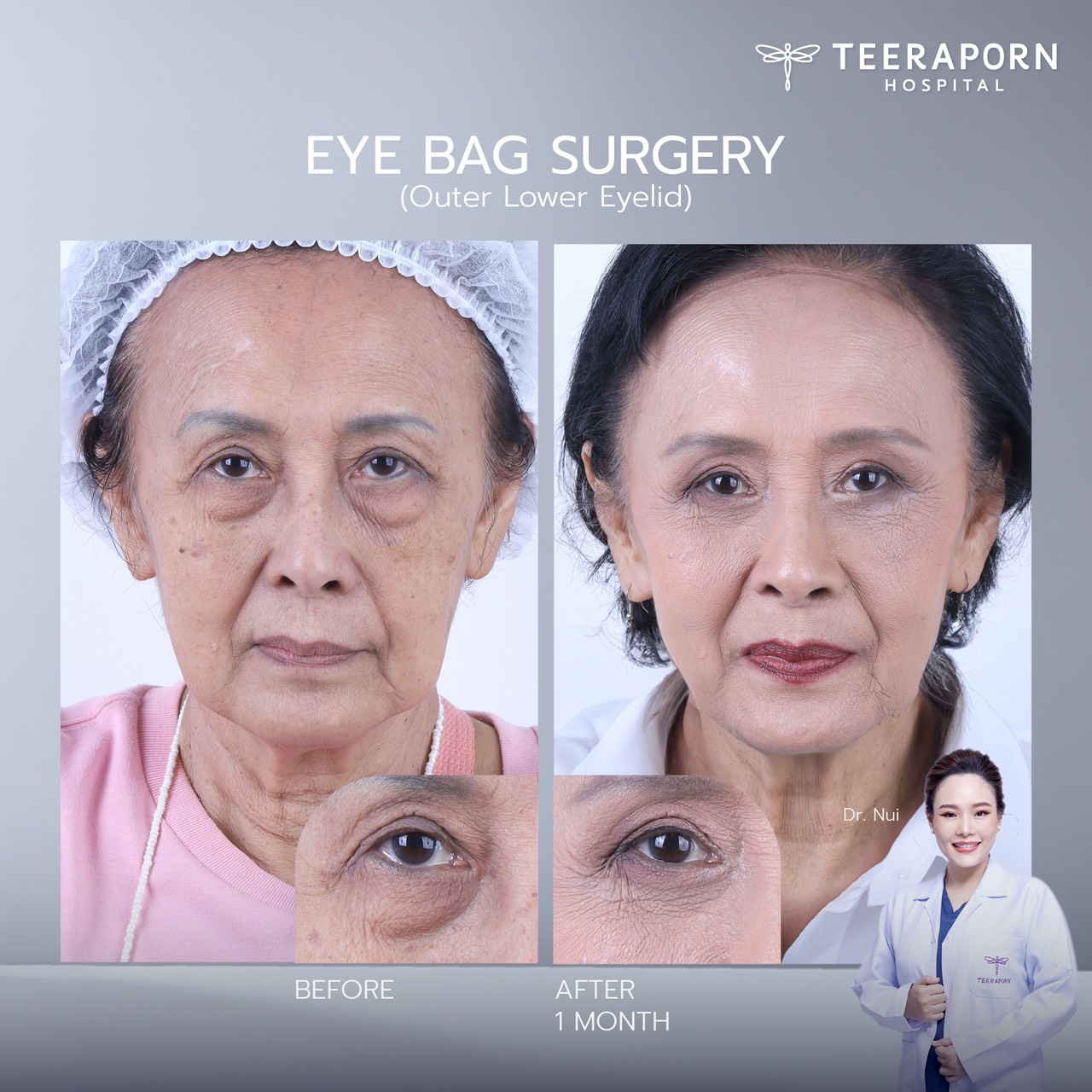 สำหรับท่านใดที่มีปัญหาถุงใต้ตาเหมือนกับแม่หน่อย หรืออยากแก้ปัญหาต่างๆ บนใบหน้า ปรึกษาทีมแพทย์ โรงพยาบาลธีรพร (Teeraporn Hospital) ได้เลยค่ะ โทร 02-026-3265 LINE ID: @teerapornclinic และติดตามทุกเรื่องเกี่ยวกับศัลยกรรมความงามได้ที่ และ https://teerapornclinic.com, https://trphospital.com/