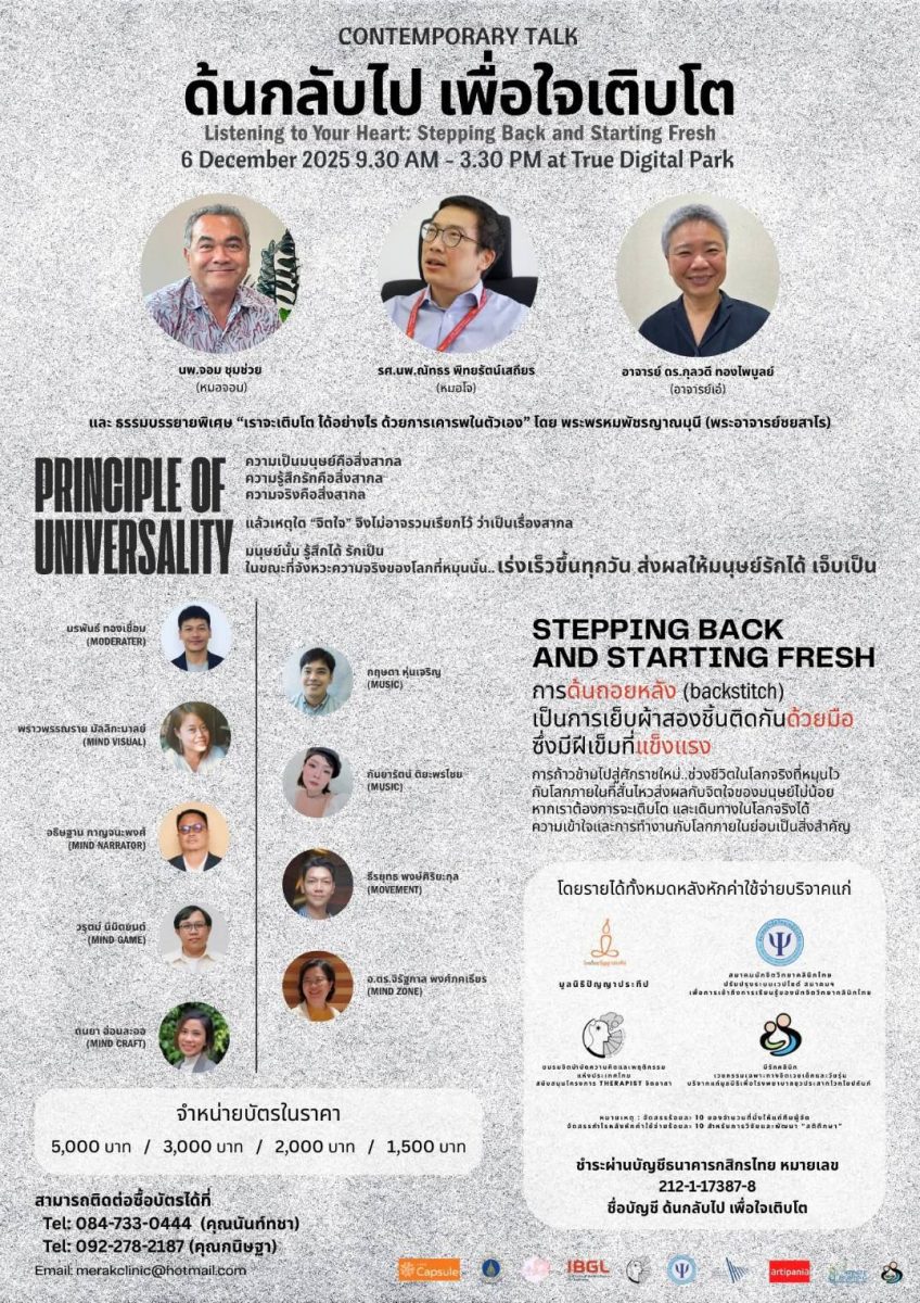 ชมรมจิตบำบัดความคิดและพฤติกรรมแห่งประเทศไทย ร่วมกับ สมาคมนักจิตวิทยาคลินิกไทย พร้อมด้วย มูลนิธิปัญญาประทีป และ มีรักคลินิค พร้อมส่งมอบสุขภาพจิตดีๆ ไปยังผู้ชมในงานCONTEMPORARY TALK “ด้นกลับไป เพื่อใจเติบโต”(ถก เทศน์ ทอล์ค) LISTENING TO YOUR HEART : STEPPING BACK AND STARTING FRESH ที่นอกจากจะได้ร่วมพูดคุยกับ อาจารย์ดร.จิรัฐกาล พงศ์ภคเธียร(จิตตปัญญา) และ นรพันธ์ ทองเชื่อม แล้วยังได้ฟังเสียงข้างใน ที่ไม่มีใครได้ยิน โดย อาจารย์ดร.กุลวดี ทองไพบูลย์(Psychodynamic) ต่อด้วยการรู้จัก โลก..ที่ไม่ใช่โรค กับ รศ.นพ.ณัทธร พิทยรัตน์เสถียร(Cognitive Behavior Therapy) และ นพ.จอม ชุมช่วย (Internal Family Systems) เราจะเติบโต ได้อย่างไร ด้วยการเคารพในตัวเอง โดย พระพรหมพัชรญาณมุนี “พระอาจารย์ชยสาโร”(พุทธธรรม)
