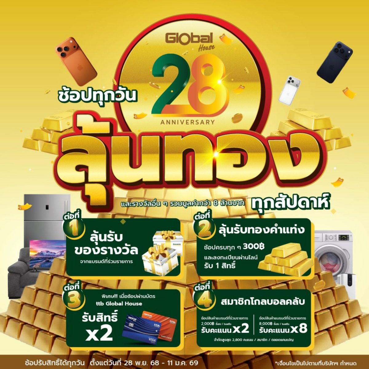 โกลบอลเฮ้าส์ ขอเชิญชวนลูกค้าสมาชิกโกลบอลคลับทุกท่าน ร่วมเป็นส่วนหนึ่งในแคมเปญ “28 ปีโกลบอลเฮ้าส์ ช้อปทุกวัน ลุ้นทอง ทุกสัปดาห์ และรางวัลอื่นๆ รวมมูลค่ากว่า 8 ล้านบาท” เพื่อแสดงความขอบคุณลูกค้าทุกท่านที่ให้การสนับสนุนและไว้วางใจเรามาโดยตลอดระยะเวลาที่ผ่านมา