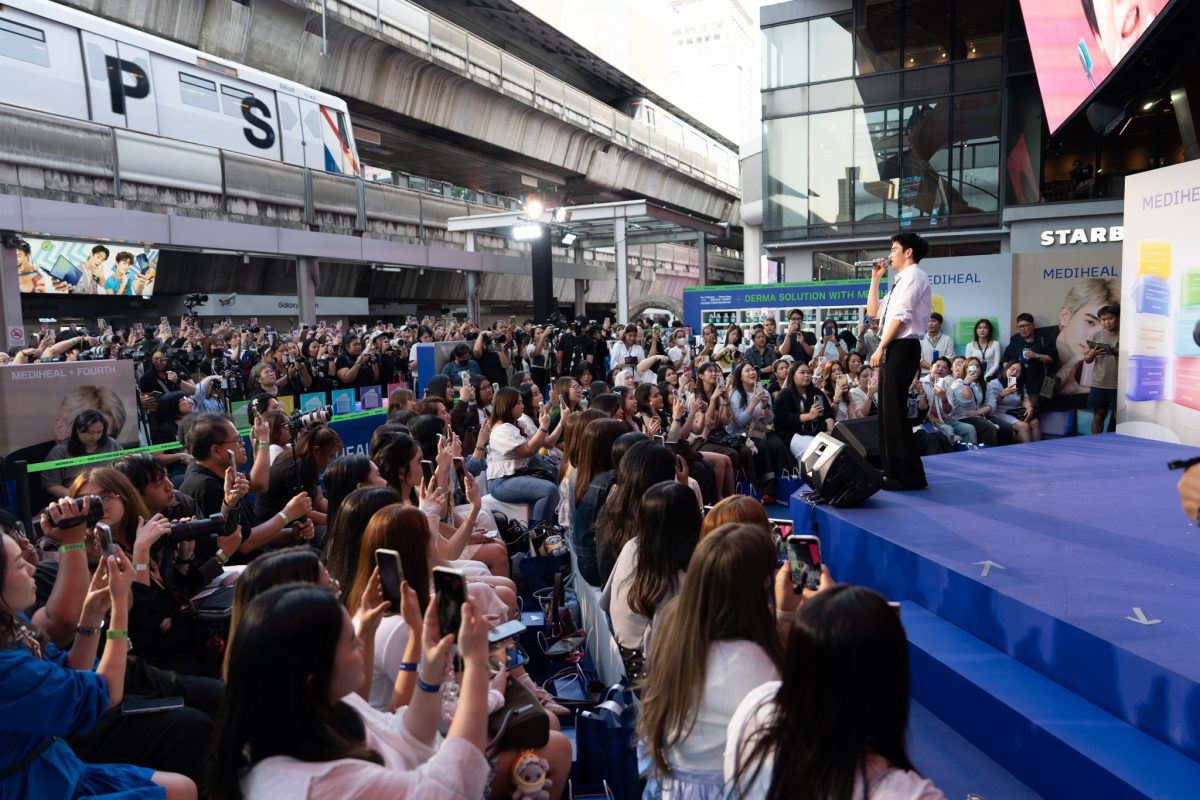 บรรยากาศภายในงาน ‘Pop-up: MEDIHEAL DERMA SHOP’ จัดเต็มท่ามกลางสื่อมวลชน ชาวสยามแฟนคลับล้นทะลัก เพราะ MEDIHEAL ขนไอเทมดูแลผิวตัวท็อปมาแบบครบเซต โดยเฉพาะ Toner Pad โทนเนอร์แพดอันดับ 1 จากเกาหลีใต้ที่หลายคนยกให้เป็นจุดเริ่มต้นของผิวดี ช่วยดูแลได้ครอบคลุมหลายปัญหาผิว และเข้าสู่ช่วงไฮไลต์เมื่อ ‘โฟร์ท ณัฐวรรธน์’ แบรนด์แอมบาสเดอร์ MEDIHEAL Toner Pad ปรากฏตัวบนเวทีด้วยลุคหนุ่มออฟฟิตที่จริงใจออร่าจับ งานผิวสุขภาพดี จนเห็นแล้วเชื่อเลยว่าผิวดีมีอยู่จริง แถมยังขึ้นมาแชร์เคล็ดลับ ‘เดอร์มาโซลูชันเพื่อผิวสุขภาพดี’ แบบไม่มีกั๊กอีกด้วย และยิ่งทำให้แฟนๆ ใจละลายกว่าเดิมเพราะกิจกรรมพิเศษสุดเอ็กซ์คลูซีฟที่ได้ใกล้ชิด ‘โฟร์ท’ ทั้งเล่นเกมและถ่ายภาพร่วมกับผู้โชคดีบนเวที เรียกเสียงกรี๊ด ดังสนั่นตลอดกิจกรรมเติมความพีกความฟินให้บรรยากาศในงานยิ่งขึ้นไปอีกขั้น