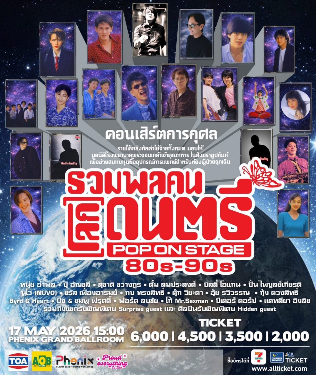 เมื่อหน้าประวัติศาสตร์ดนตรีที่เคยสร้างความประทับใจให้คนไทยทั้งประเทศกำลังจะกลับมาโลดแล่นอีกครั้ง! สัญลักษณ์แห่งยุคทองอย่าง “โลกดนตรี” ถูกปลุกให้มีชีวิตภายใต้มหาปรากฏการณ์คอนเสิร์ตการกุศลครั้งประวัติ ศาสตร์ “รวมพลคนโลกดนตรี POP ON STAGE 80s-90s” ในวันที่ 17 พฤษภาคม 2569 ณ Phenix Grand Ballroom การรวมตัวของ 20 ศิลปินระดับไอคอนิกบนเวทีเดียวกัน เพื่อภารกิจที่ยิ่งใหญ่กว่าความบันเทิง คือการระดมทุนจัดซื้ออุปกรณ์การแพทย์มอบให้ “ห้องผู้ป่วยฉุกเฉิน (ER)” ผ่านมูลนิธิโรงพยาบาลพระจอมเกล้าเจ้าคุณทหาร ในสังฆราชูปถัมภ์