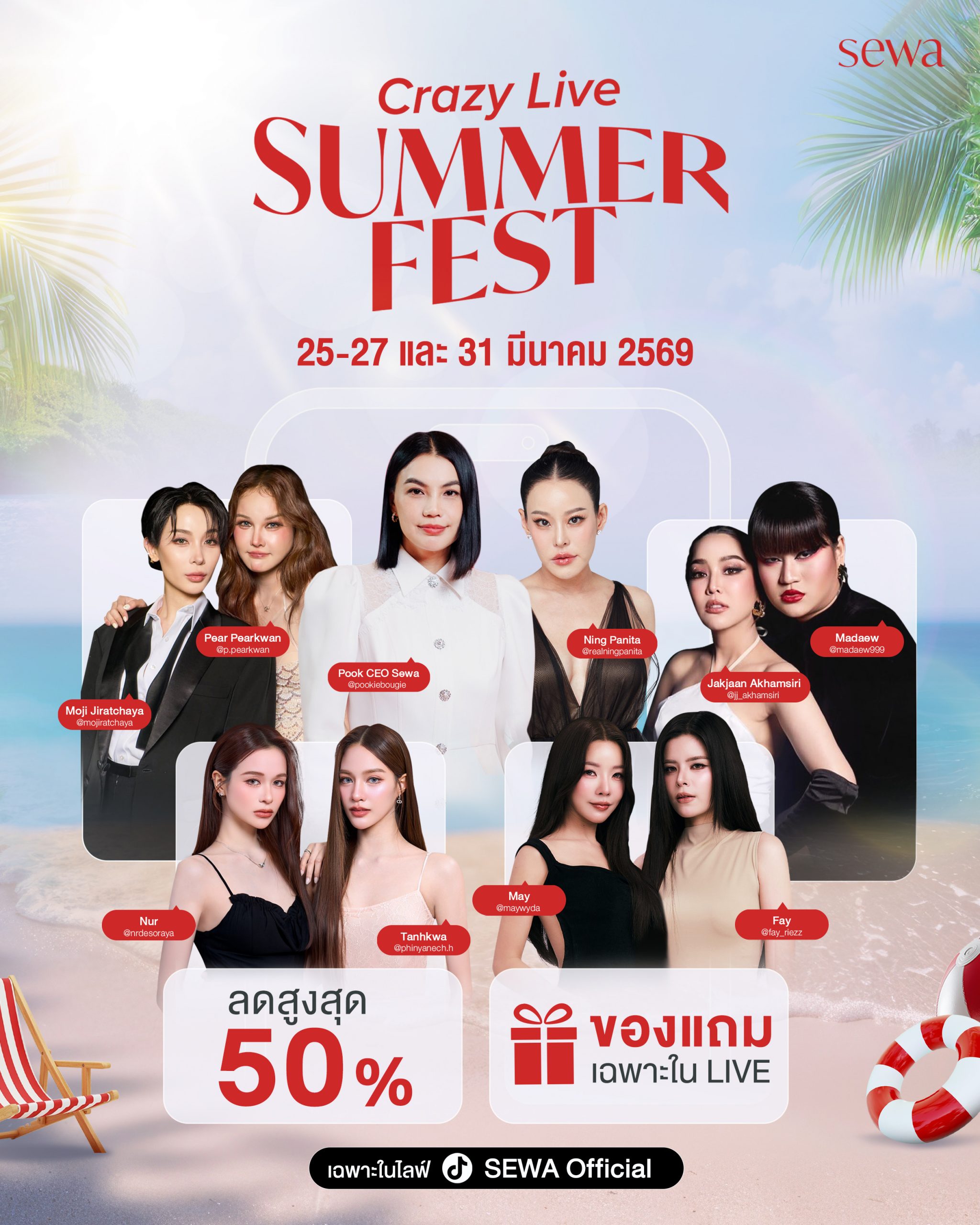 แต่คือการอัปเกรดผิวแบบครบจบในหลอดเดียว #กันแดดไฮบริดฟิลเตอร์ พร้อมสารสกัดแน่น SPF50+ PA++++ ปกป้องครบ UVA/UVB บำรุงลึกถึงผิว 7 เท่า ผิวดูสุขภาพดีขึ้นจริง เนื้อบางเบา ซึมไว ไม่รบกวนเมคอัพ ช่วยปกป้องผิวจากมลภาวะ & ฝุ่น PM2.5 ตอบโจทย์ทุกสภาพผิว เริ่มปฏิการเปิดปาร์ตี้ Crazy Live Sewa Summer Fest ปักหมุดเริ่มคิวแรก 25 มีนาคม เวลา 18.00 พบกับซีอีโอตัวแม่กูรูงานผิว “คุณปุ๊ก-เบญจกิติ เมฆแสน” พร้อมด้วยตัวแม่ตัวมัม “หนิง ปณิตา” ที่จะมาตัดริบบิ้นปล่อยโปรเด็ด และ เวลา 20.00 น.เป็นต้นไป พบกับคู่จิ้นสะท้านเมือง “โม-แพรขวัญ” จาก “เดอะเทคฮอร์โมน” คิววันที่ 26 มีนาคม เวลา 18.00 เช็คลิสต์กันต่อที่ “ซีอีโอปุ๊ก ปะทะ “หนิงปณิตา” ฟาดต่อด้วยเวลา 20.00 น. พบกับ เจ้าแม่ไวรัลแห่งยุค “มะเดี่ยว” และ “น้องงอแง” ที่มาพร้อมกับพี่สาวคู่ใจ “จั๊กจั่น อคัมย์สิริ” วันที่ 27 มีนาคม เอาใจชาวเดอร์ และแฟนๆยูริ พบกับคู่จิ้นเคมีดีย์ต่อใจ “แตงกวา-เหนือ” มาพร้อมความฟินชุดใหญ่ไฟกะพริบ ตั้งแต่เวลา 19.00 น.เป็นต้นไป และ ปิดท้ายปลายเดือน 31 มีนาคม ดับอุณหภูมิความร้อนช่วงซัมเมอร์ด้วยคู่หวานสุดโบ๊ะบ๊ะ “เฟ-เมษ์” ที่พร้อมมาเซย์ฮัลโหลแฟนไทยและแฟนอินเตอร์ ดำเนินรายการด้วยตัวแม่สายชง “โซล SosatSeoulsay” ฟินจิกหมอนแน่นอน