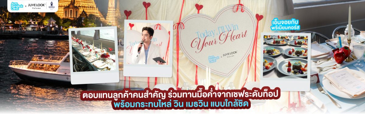 Aura Bangkok Clinic X Juvelook Volume ทุ่มงบกว่าล้านบาท ชวน วิน เมธวิน จัดดินเนอร์บนเรือยอชต์หรูสุดอลังการ ในธีม Today, I’ll Win Your Heart พาแฟนคลับร่วมทานมื้อค่ำจากเชฟระดับทอป