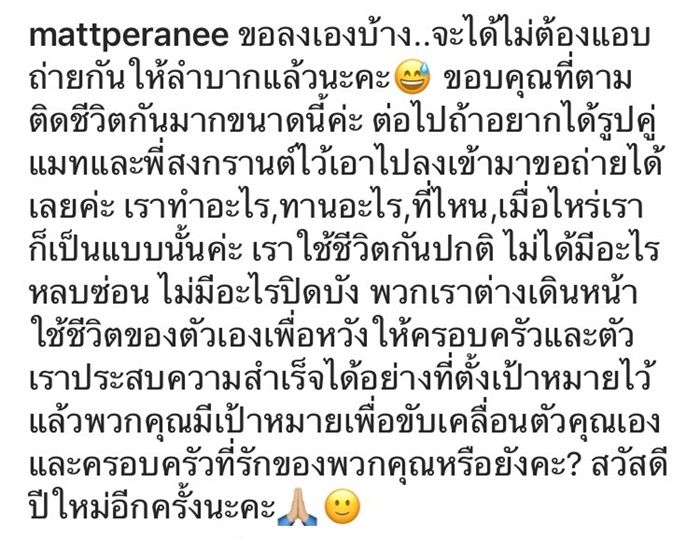 โดยภาพดังกล่าวเป็นภาพคู่ของเธอกับหนุ่มสงกรานต์ที่มีแคปชั่นบรรยายใต้ภาพอย่างดุเด็ดเผ็ดมันส์ว่า “ขอลงเองบ้าง..จะได้ไม่ต้องแอบถ่ายกันให้ลำบากแล้วนะคะ ขอบคุณที่ตามติดชีวิตกันมากขนาดนี้ค่ะ ต่อไปถ้าอยากได้รูปคู่แมทกับพี่สงกรานต์ไว้เอาไปลงเข้ามาขอถ่ายได้เลยค่ะ เราทำอะไร,ทานอะไร,ที่ไหน,เมื่อไหร่เราก็เป็นแบบนั้นค่ะ เราใช้ชีวิตกันปกติ ไม่ได้มีอะไรหลบซ่อน ไม่มีอะไรปิดบัง พวกเราต่างเดินหน้าใช้ชีวิตของตัวเองเพื่อหวังให้ครอบครัวและตัวเราประสบความสำเร็จได้อย่างที่ตั้งเป้าหมายไว้ แล้วพวกคุณมีเป้าหมายเพื่อขับเคลื่อนตัวคุณเองและครอบครัวที่รักของพวกคุณหรือยังคะ? สวัสดีปีใหม่อีกครั้งนะคะ” อุ๊ยตาย ว้ายกรี๊ด เผ็ดแซบขนาดนี้สมเป็นนางเอกสุดมั่นแห่งปี 2018 ข้ามมาถึงปี 2019 จริงๆ ค่ะแม่คู้นนนน
