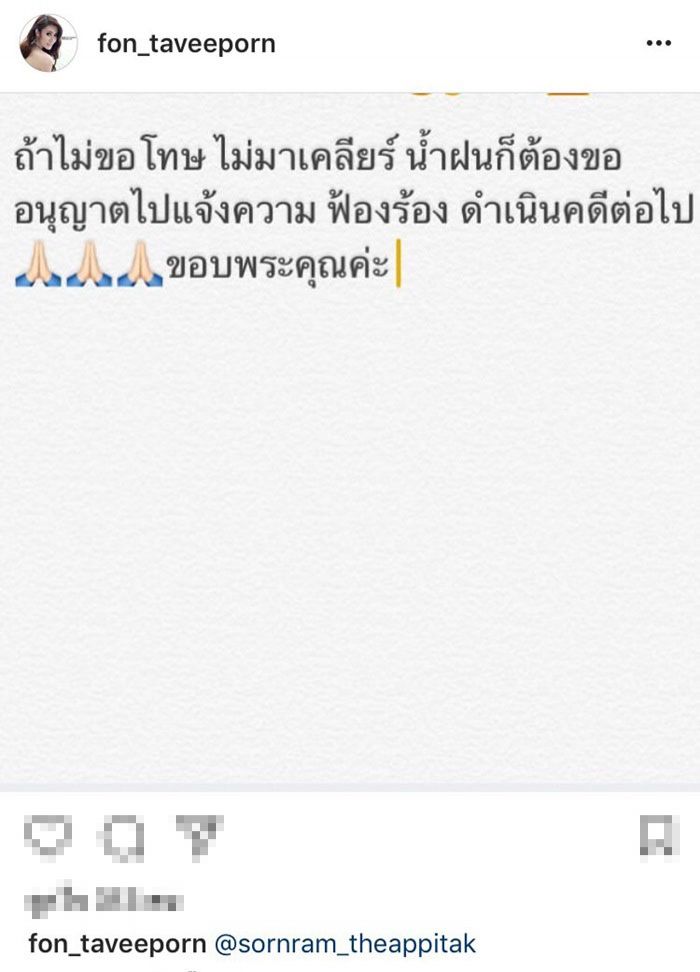 ดราม่าไม่จบไม่สิ้นสำหรับ น้ำฝน ทวีพร สาวสวยผู้เคยตกเป็นข่าวกิ๊กกั๊กกับว่าที่คุณพ่อ หนุ่ม ศรราม ล่าสุดโพสต์ดราม่าให้ชาวเน็ตได้งงกันอีกครั้งกับข้อความที่แท็กถึงหนุ่มว่า “ถ้าไม่ขอโทษ ไม่มาเคลียร์ น้ำฝนก็ต้องขออนุญาตไปแจ้งความ ฟ้องร้อง ดำเนินคดีต่อไป ขอบพระคุณค่ะ” อุ๊ตะ! เห็นแล้วงงเป็นไก่ตาแตกว่ามันเรื่องอะไรยังไงกันอีก! หากย้อนไปก่อนหน้านั้นเป็นที่รู้กันว่าสาวน้ำฝนจบความสัมพันธ์กับพระเอกหนุ่มแบบไม่สวยนัก แม้เวลานี้พ่อคุณจะแต่งงานจนใกล้จะได้เป็นพ่อคนแล้วก็ตาม