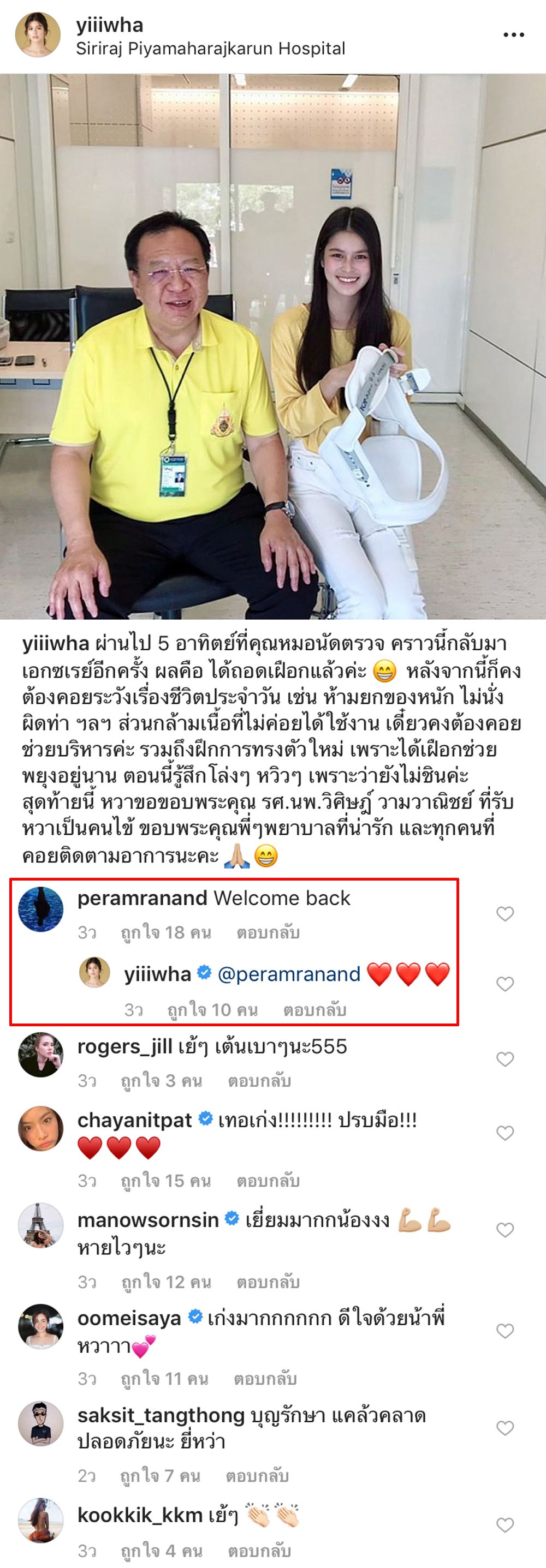 โดยมีหวานใจหนุ่มอย่าง เปอร์ สุวิกรม ผู้ที่คอยดูแลอยู่เคียงข้างตลอดตั้งแต่เมื่อครั้งประสบอุบัติเหตุ เข้ามาคอมเม้นท์แสดงความยินดีว่า “Welcome back” รวมถึงเพื่อนพ้องน้องพี่ในวงการก็เข้ามาคอมเม้นท์แสดงความยินดีให้กับสาวสวยคนเก่งคนนี้กันเพียบ