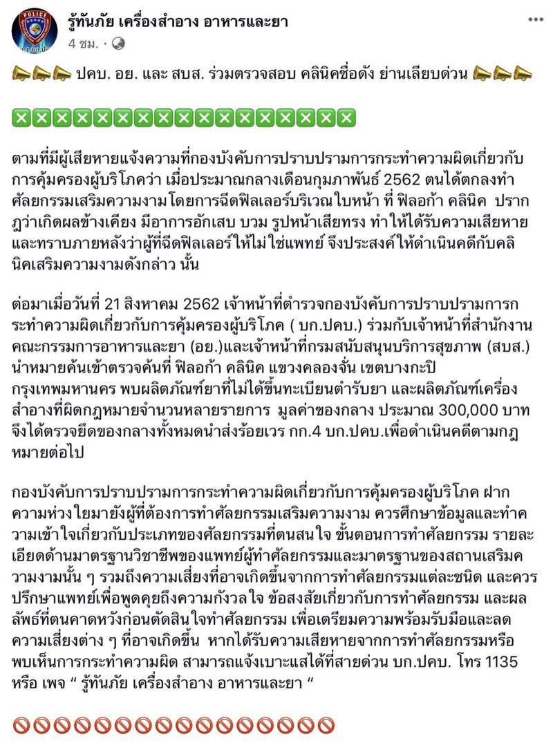 จากกรณีที่เจ้าหน้าที่ตำรวจกองบังคับการปราบปรามการกระทำความผิดเกี่ยวกับการคุ้มครองผู้บริโภค (บก.ปคบ.) ร่วมกับเจ้าหน้าที่สำนักงานคณะกรรมการอาหารและยา (อย.) พร้อมทั้งเจ้าหน้าที่กรมสนับสนุนการบริการสุขภาพ (สบส.) นำหมายค้นเข้าตรวจที่ Filorga Clinic ซึ่งเป็นคลินิกเกี่ยวกับความงามของ ไฮโซน้ำหวาน พัสวี ภรรยาของ นาวินตาร์ เยาวพลกุล และมีเหล่าดาราชื่อดังเป็นพรีเซ็นเตอร์ โดยการตรวจสอบพบผลิตภัณฑ์ยาที่ไม่ได้ขึ้นทะเบียนตำรับยา และผลิตภัณฑ์เครื่องสำอางที่ผิดกฎหมาย จำนวนหลายรายการ มูลค่าของกลางประมาณ 300,000 บาท จึงได้ยึดของกลางทั้งหมดนำส่งร้อยเวร กก.4 บก.ปคบ. เพื่อดำเนินคดีตามกฎหมายต่อไป