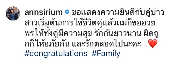 แฟนคลับเพิ่งจะรับรู้ข่าวดีว่าลูกสาวคนสวยอย่าง นนนี่ นนลนีย์ ถูกแฟนหนุ่มเซอร์ไพรส์ขอแต่งงานที่ลอนดอน ล่าสุดคุณแม่ยังสาว แอน สิเรียม โพสต์ภาพน่ายินดีอีกระลอกแล้ว โดยเธอเคลื่อนไหวอินสตาแกรมด้วยภาพของลูกสาวในชุดเจ้าสาวเคียงข้างเจ้าบ่าวอย่าง พอล งามวัฒน์ เรียกว่าขอปุ๊บแต่งปั๊บ ไวเวอร์จนแฟนคลับตามยินดีแทบไม่ทัน