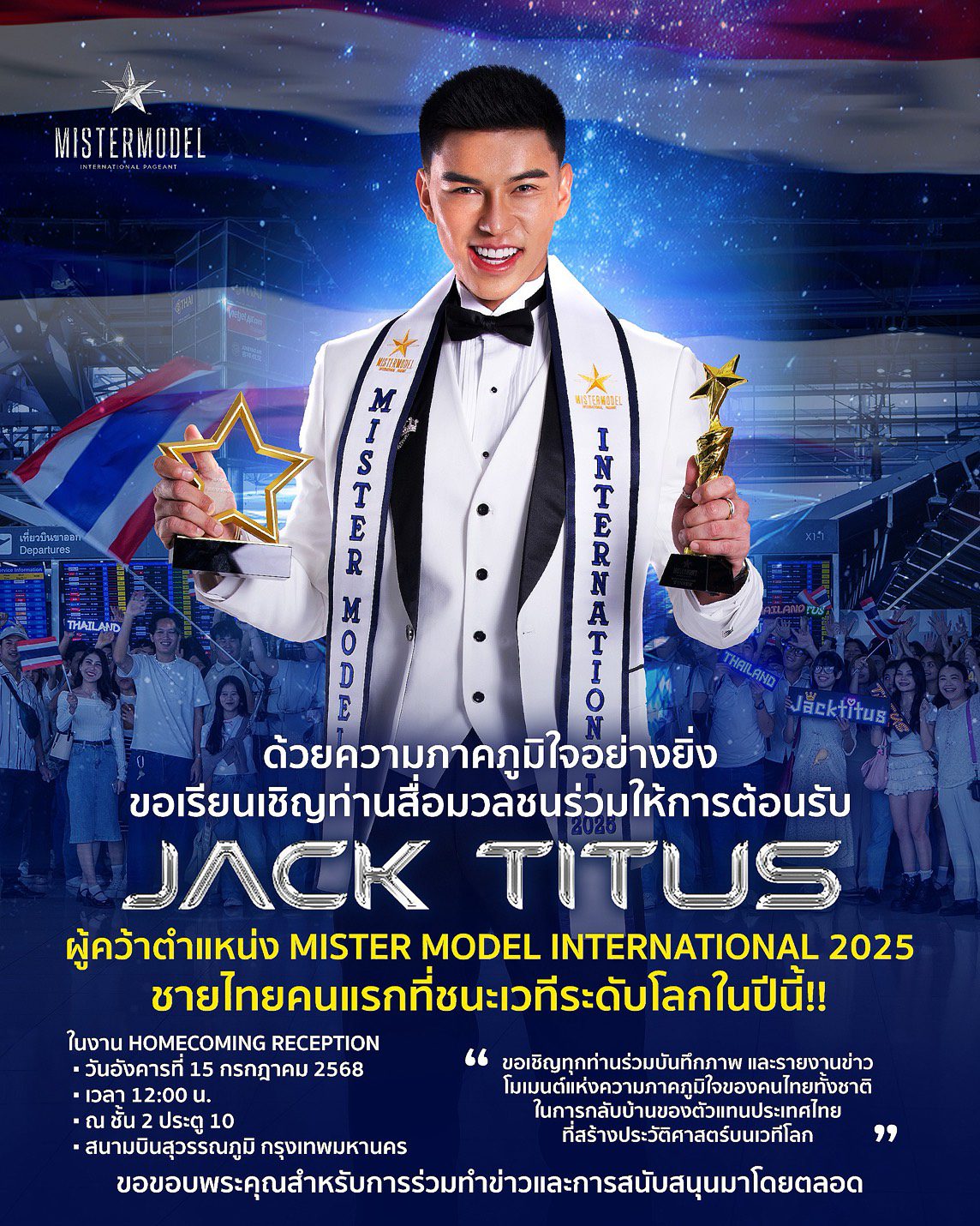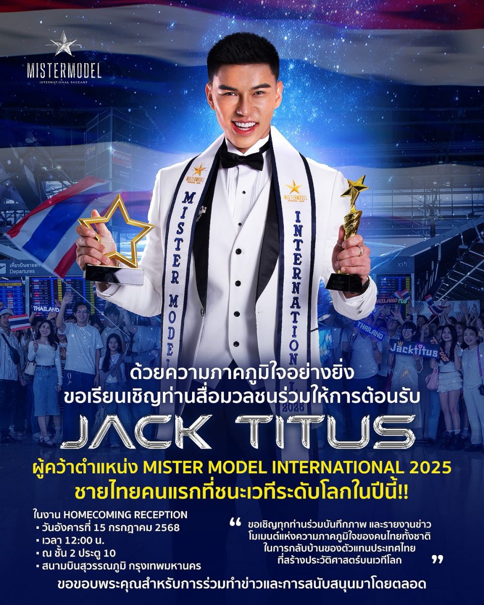 เดินทางกลับถึงประเทศไทยแล้วสำหรับ “แจ็ค ไททัส” นายแบบสายเลือดไทย หลังจากไปคว้ารางวัลชนะเลิศ การประกวด Mister Model International 2025 ที่ประเทศโคลอมเบีย นับเป็นหนุ่มไทยคนที่ 2 ที่สามารถสร้างประวัติศาสตร์คว้ารางวัลนี้มาครองได้สำเร็จ สร้างความภาคภูมิใจให้กับคนไทย งานนี้มีเหล่าแฟนนางงามไปต้อนรับกันแน่นสนามบิน ส่งเสียงเรียกชื่อแจ็คและคำว่าไทยแลนด์ๆ ก้องสนามบินเลยทีเดียว