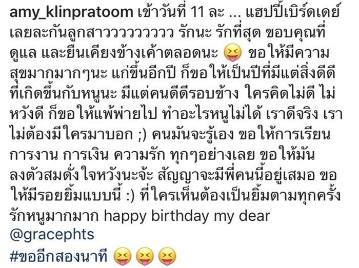 ครั้นวกเข้าประเด็นที่ว่าวันคล้ายวันเกิดของสาว เกรซ สุดที่รักของหนุ่ม พอร์ช ศรัณย์ น้องสาวของนักแสดงสายแซ่บ กีฟ ดราภดา เมื่อกลางเดือนก่อน สาวเอมี่โพสต์ภาพพร้อมข้อความอวยพรยาวเหยียดในอินสตาแกรม ซึ่งรายละเอียดในข้อความนั้นอ่านดูแล้วทะแม่งๆ เหมือนแซะเหมือนจิกกัดใครอ๊ะเปล่า เพราะเป็นที่รู้กันว่า หนูเกรซ มีปัญหากับผู้เป็นพี่สาวถึงขั้นตัดพี่ตัดน้อง งานนี้เอมี่ก็ยืนยันว่าไม่ได้แซะใครจริงๆ และไม่ได้อยู่ฝ่ายไหน เพียงแต่สนิทกับ พอร์ช-เกรซ มากกว่าอีกฝ่าย จึงอยากอวยพรให้น้องเจอสิ่งดีๆ และตนก็ไม่กลัวว่าจะมีปัญหากับใครด้วย