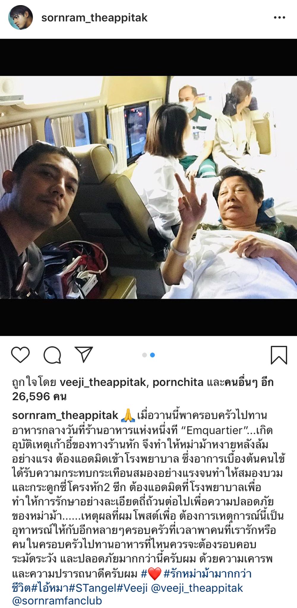 “เมื่อวานนี้พาครอบครัวไปทานอาหารกลางวันที่ร้านอาหารแห่งหนึ่ง…เกิดอุบัติเหตุเก้าอี้ของทางร้านหัก จึงทำให้หม่าม้าหงายหลังล้มอย่างแรง ต้องแอดมิทเข้าโรงพยาบาล ซึ่งอาการเบื้องต้นคนไข้ได้รับความกระทบกระเทือนสมองอย่างแรงจนทำให้สมองบวม และกระดูกซี่โครงหัก 2 ซี่ ต้องแอดมิทที่โรงพยาบาลเพื่อทำการรักษาอย่างละเอียดถี่ถ้วนต่อไปเพื่อความปลอดภัยของหม่าม้า……เหตุผลที่ผมโพสต์เพื่อต้องการให้เหตุการณ์นี้เป็นอุทาหรณ์ให้กับอีกหลายๆ ครอบครัวที่เวลาพาคนที่เรารักหรือคนในครอบครัวไปทานอาหารที่ไหนควรจะต้องรอบคอบ ระมัดระวัง และปลอดภัยมากกว่านี้ครับผม ด้วยความเคารพ และความปรารถนาดีครับผม #รักหม่าม้ามากกว่าชีวิต#ไอ้หมา#STangel#Veeji @veeji_theappitak @sornramfanclub”